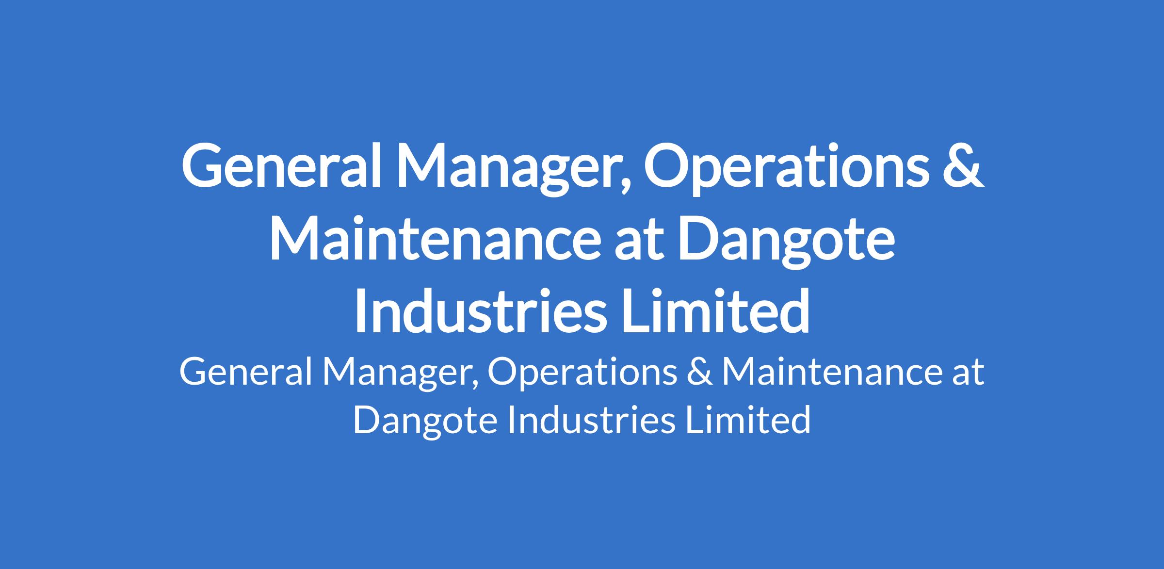Dangote Industries Limited is recruiting to fill. the position of: General Manager, Operations & Maintenance. The position is located in Lagos State. Interested candidates should possess a Bachelors Degree or its equivalent in Engineering or related discipline with a minimum of twenty (20) years experience in repairs and maintenance of cement manufacturing equipment.
