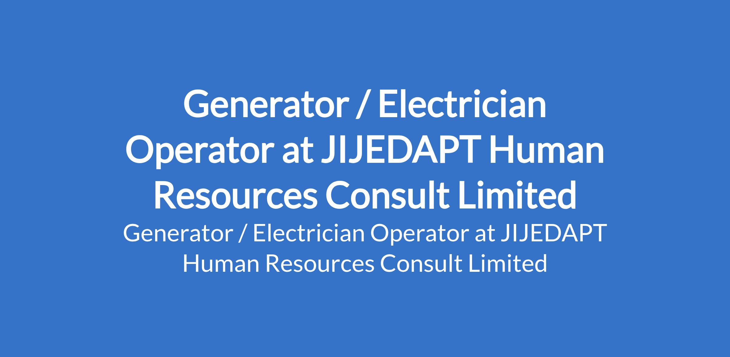 JIJEDAPT Human Resources Consult Limited is recruiting to fill the position of: Generator / Electrician Operator. The position is located in Agadagba - Obon, Ondo State. Interested candidates should possess minimum of a Secondary School Certificate (SSCE) or equivalent (qualification in Electrical Engineering / Power Systems is an added advantage) with 3 5 years of hands-on experience as a Generator Operator / Electrician.