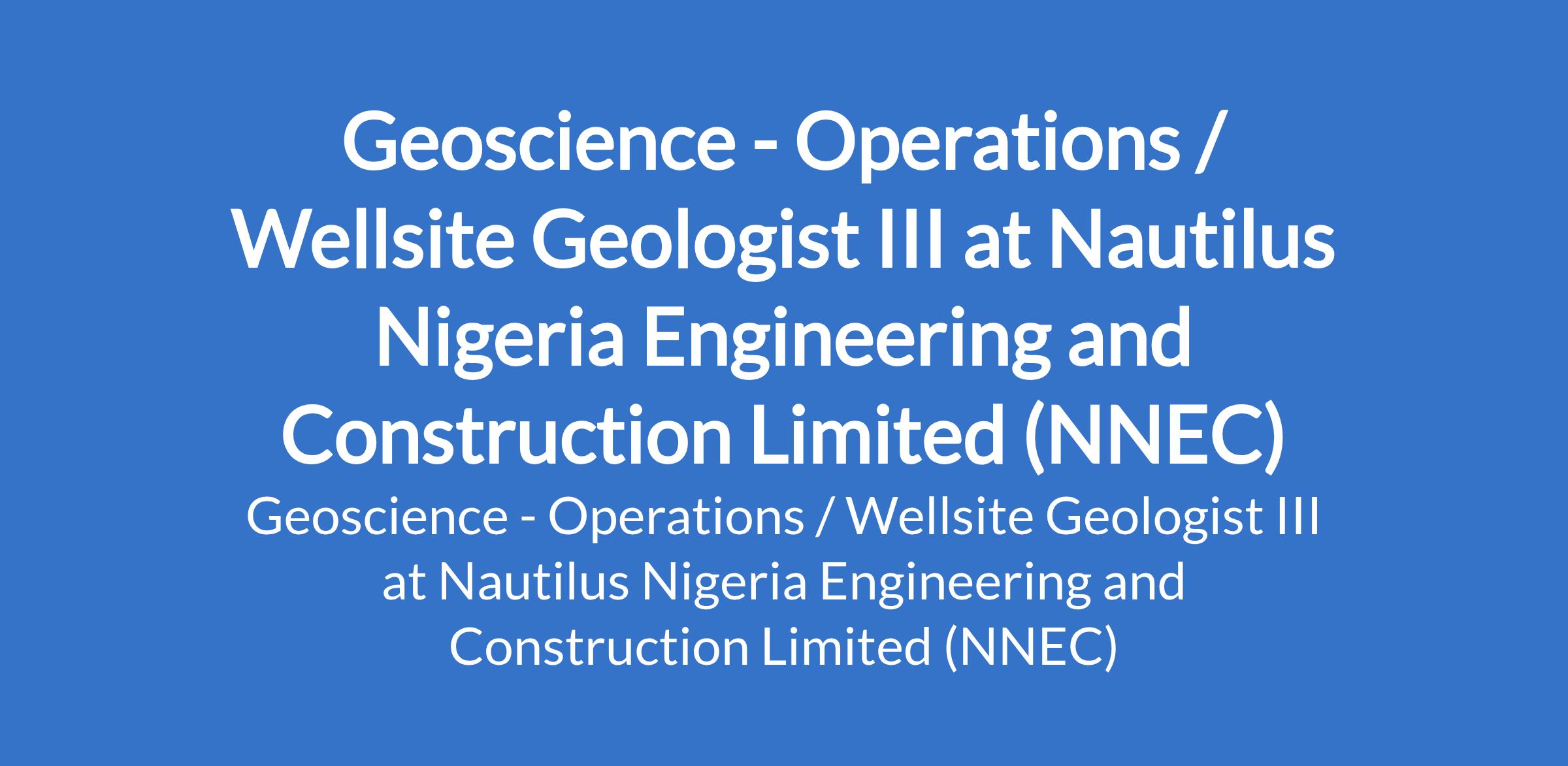 Nautilus Nigeria Engineering and Construction Limited (NNEC) is recruiting to fill the position of: Geoscience - Operations / Wellsite Geologist III. The position is located in Lagos State. Interested candidates should possess a BSc / MSc in Geology from a recognized institution with experience as a Wellsite Geologist.