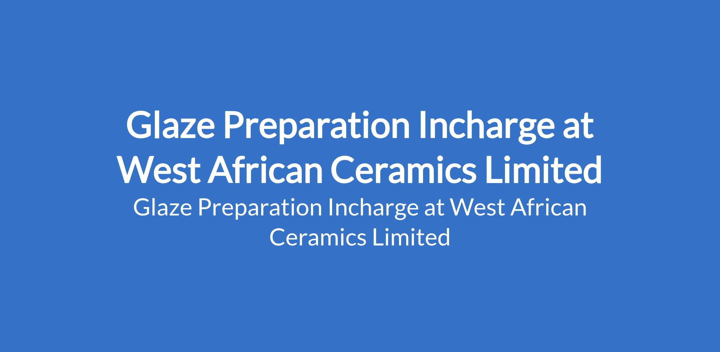 West African Ceramics Limited is recruiting to fill the position of: Glaze Preparation Incharge. The position is located in Kogi State. Interested candidates should possess a Degree in Ceramic Engineering, Chemical Engineering, or related field with 710 years experience in glaze/ceramic production.