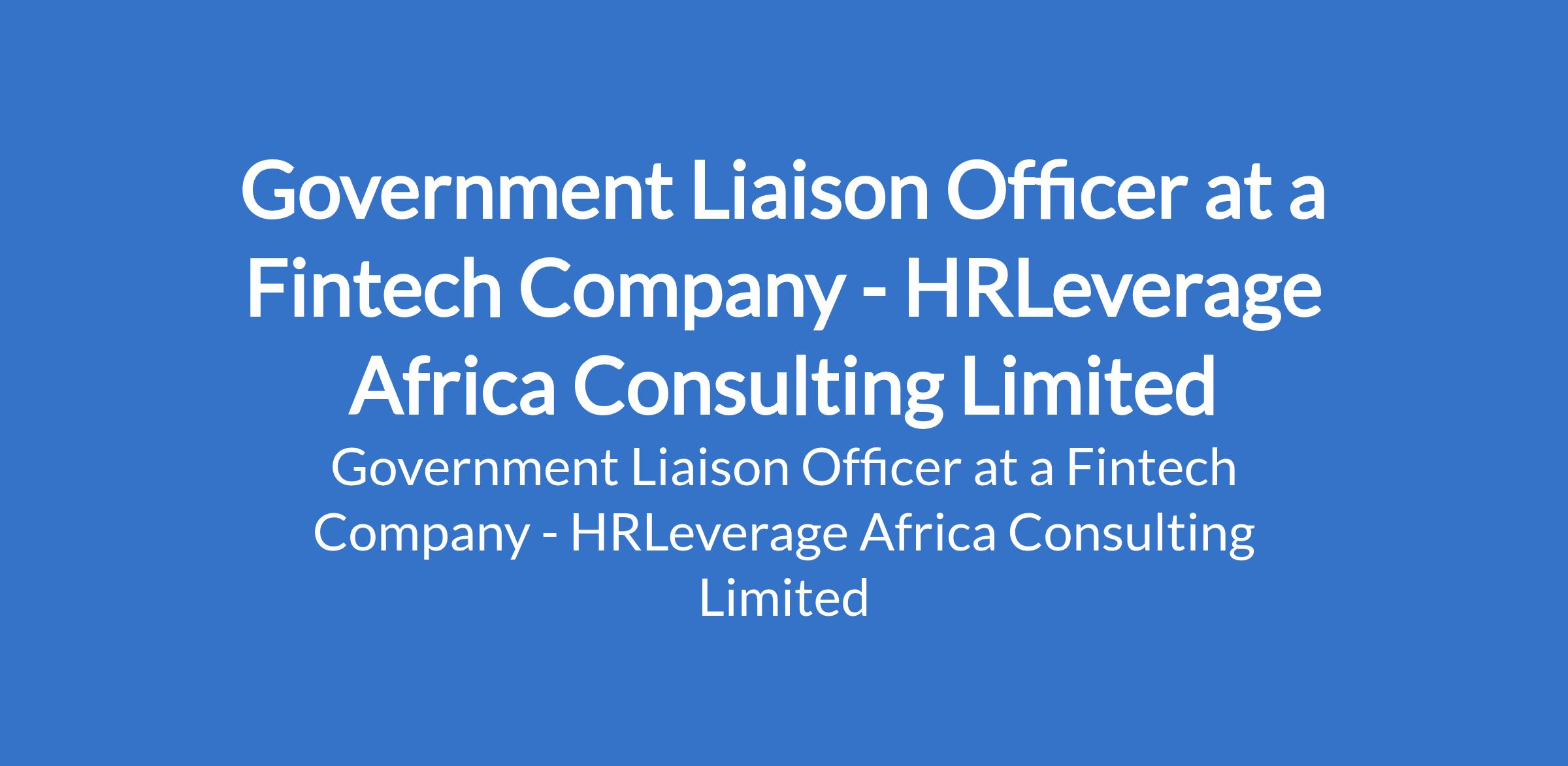 HRLeverage Africa Consulting Limited - Our client, operating in the Fintech sector is recruiting to fill the position of: Government Liaison Officer. The position is located in Abuja (FCT) , State. Salary:N250,000 N300,000 per month. Interested candidates should possess a Bachelors Degree in Law, Public Policy, Political Science, Business Administration, or a related field with a minimum of five years relevant experience.