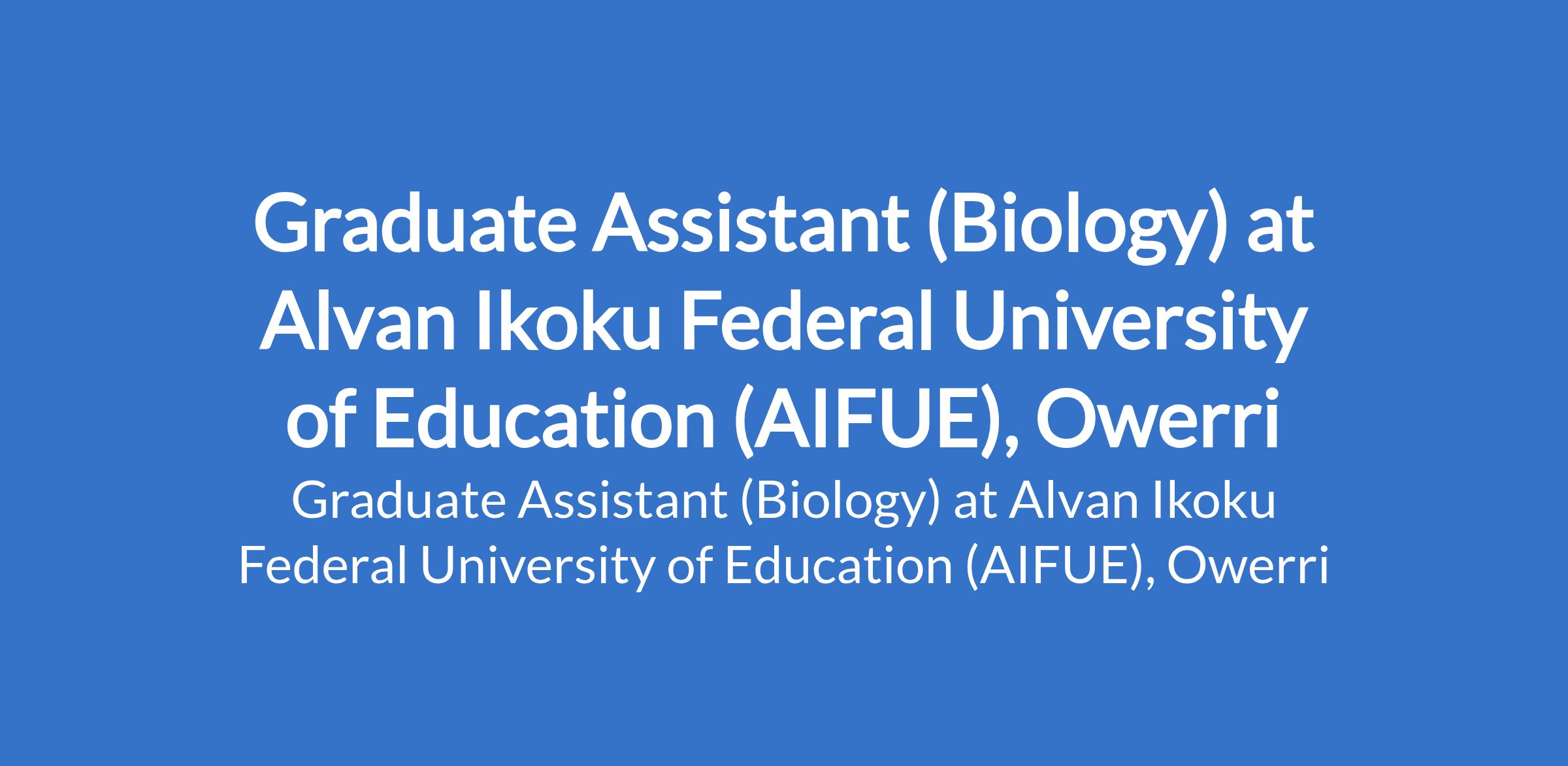 Alvan Ikoku Federal University of Education (AIFUE), Owerri invites applications from suitably qualified candidates for the position of: Graduate Assistant (Biology). The position is located in Imo State. Interested candidates should possess a First Degree in the relevant field from a recognized university with not less than Second Class Upper Division, must show interest in pursuing an academic career.