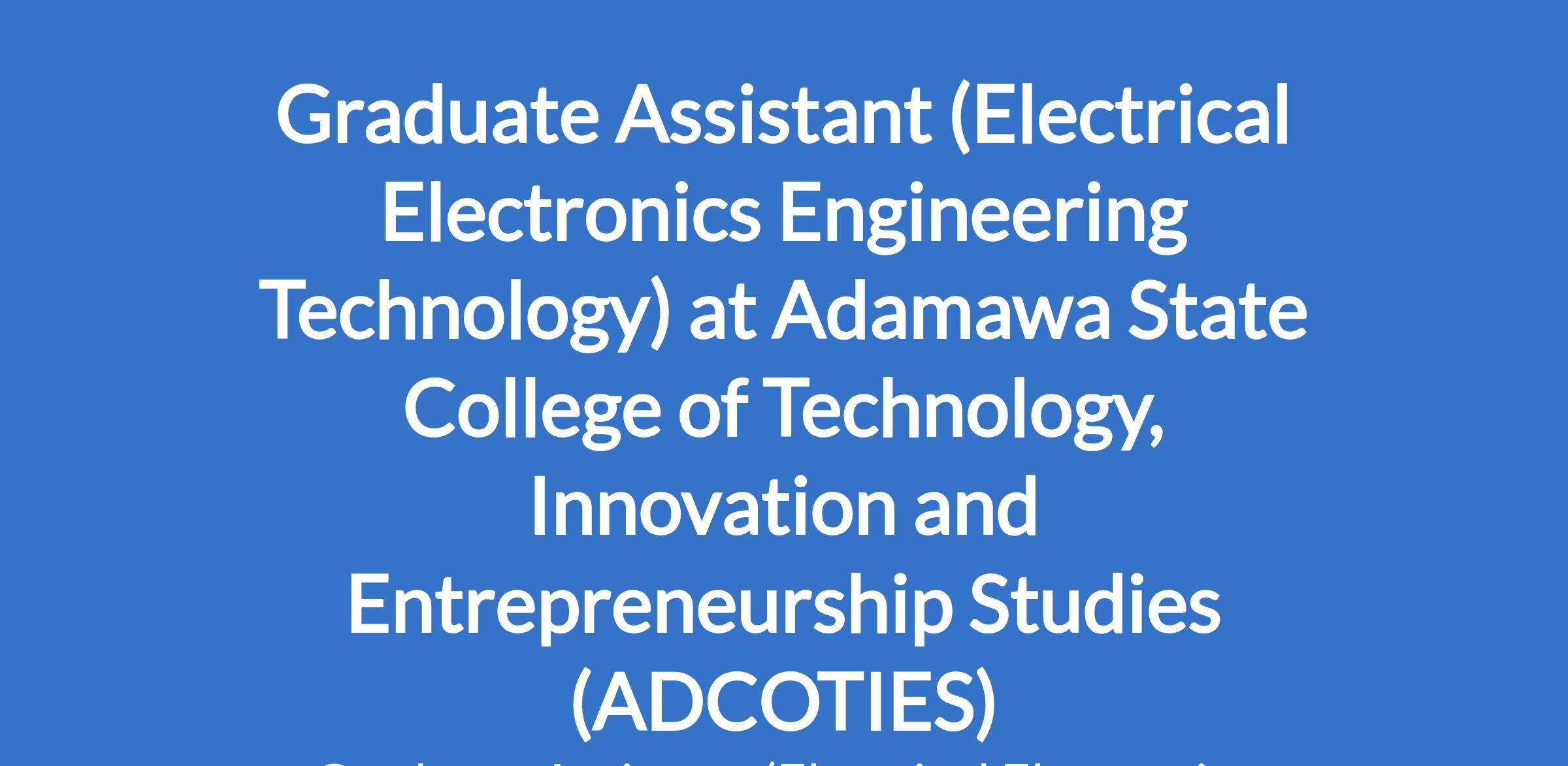 Adamawa State College of Technology, Innovation and Entrepreneurship Studies (ADCOTIES) is recruiting to fill the position of: Graduate Assistant (Electrical Electronics Engineering Technology). The position is located in Gulak, Adamawa State. Interested candidates should possess a Bachelors Degree with a minimum of Second Class Upper or HND with Distinction from a recognized institution plus NYSC discharge or exemption certificate.