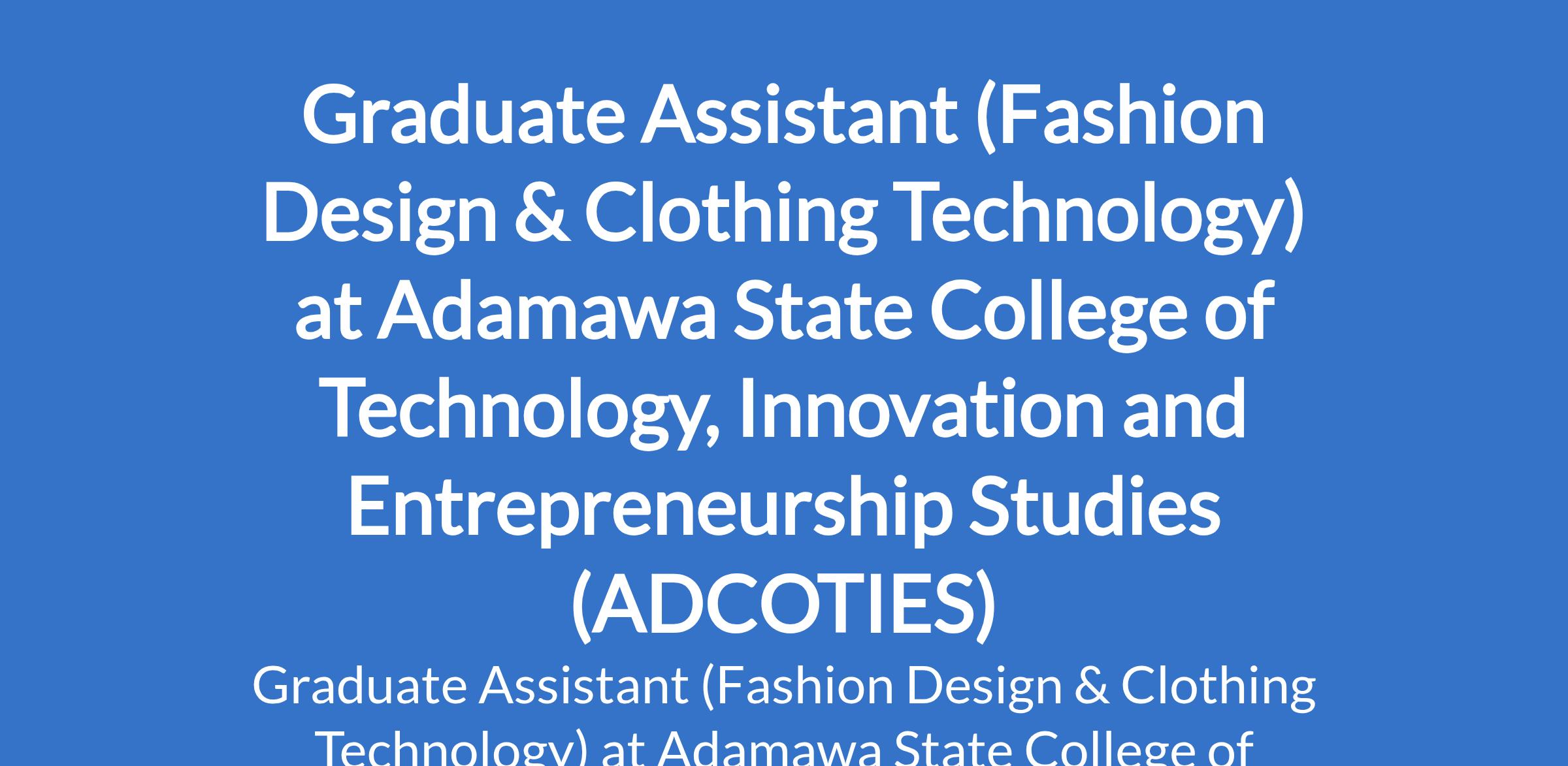 Adamawa State College of Technology, Innovation and Entrepreneurship Studies (ADCOTIES) is recruiting to fill the position of: Graduate Assistant (Fashion Design & Clothing Technology). The position is located in Gulak, Adamawa State. Interested candidates should possess a Bachelors Degree with a minimum of Second Class Upper or HND with Distinction from a recognized institution plus NYSC discharge or exemption certificate.