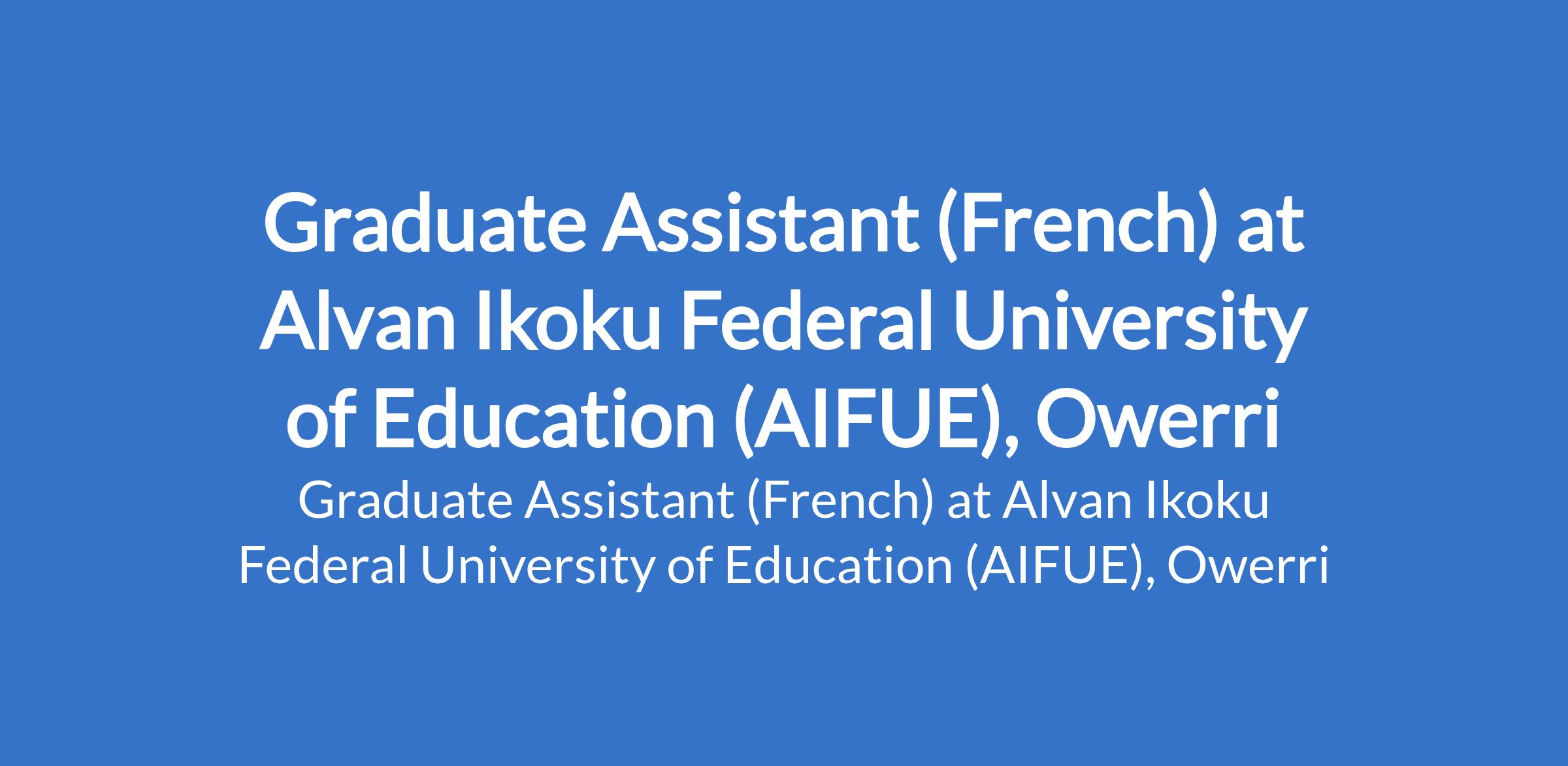 Alvan Ikoku Federal University of Education (AIFUE), Owerri invites applications from suitably qualified candidates for the position of: Graduate Assistant (French). The position is located in Imo State. Interested candidates should possess a First Degree in the relevant field from a recognized university with not less than Second Class Upper Division, must show interest in pursuing an academic career.