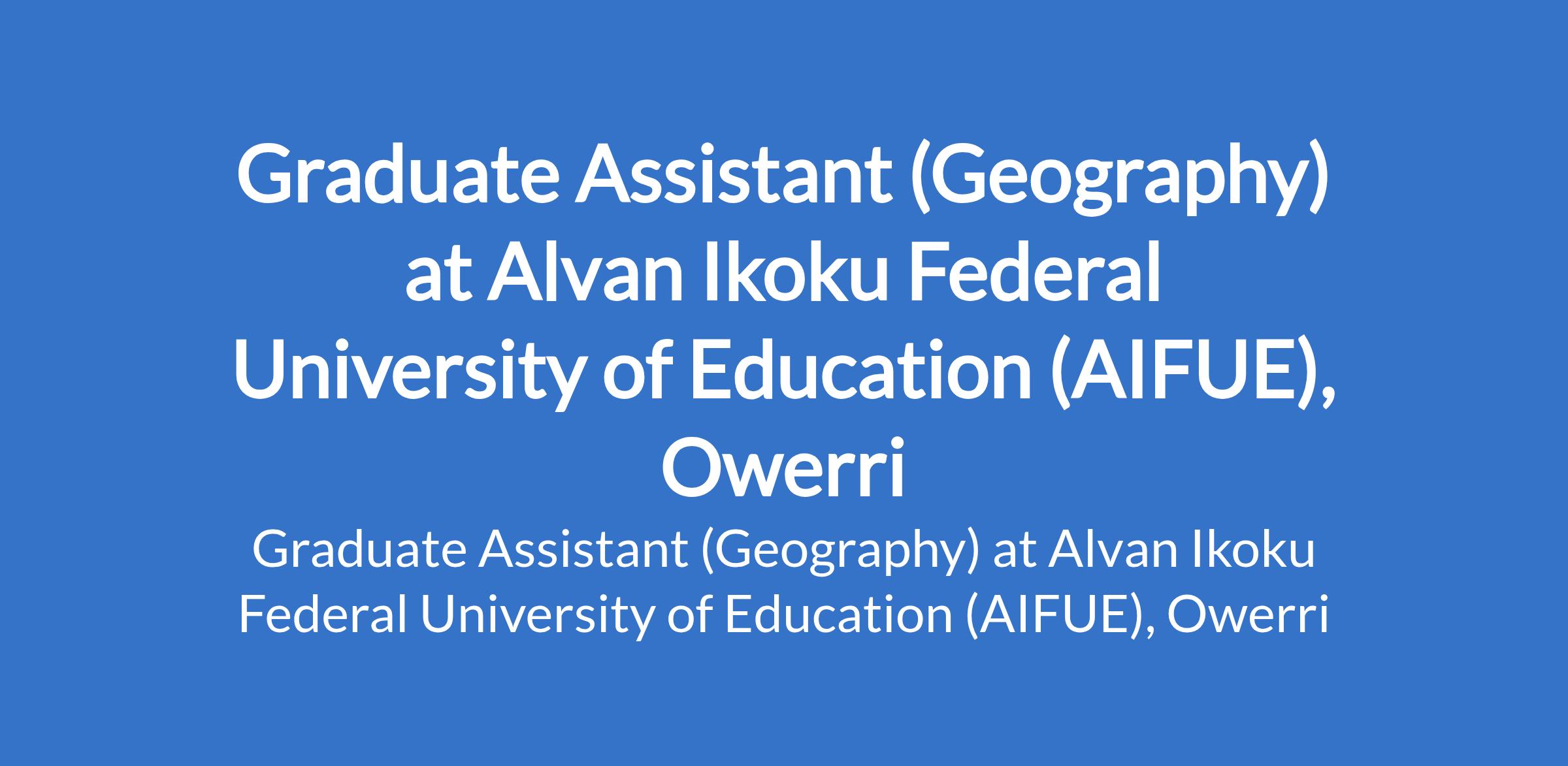 Alvan Ikoku Federal University of Education (AIFUE), Owerri invites applications from suitably qualified candidates for the position of: Graduate Assistant (Geography). The position is located in Imo State. Interested candidates should possess a First Degree in the relevant field from a recognized university with not less than Second Class Upper Division, must show interest in pursuing an academic career.