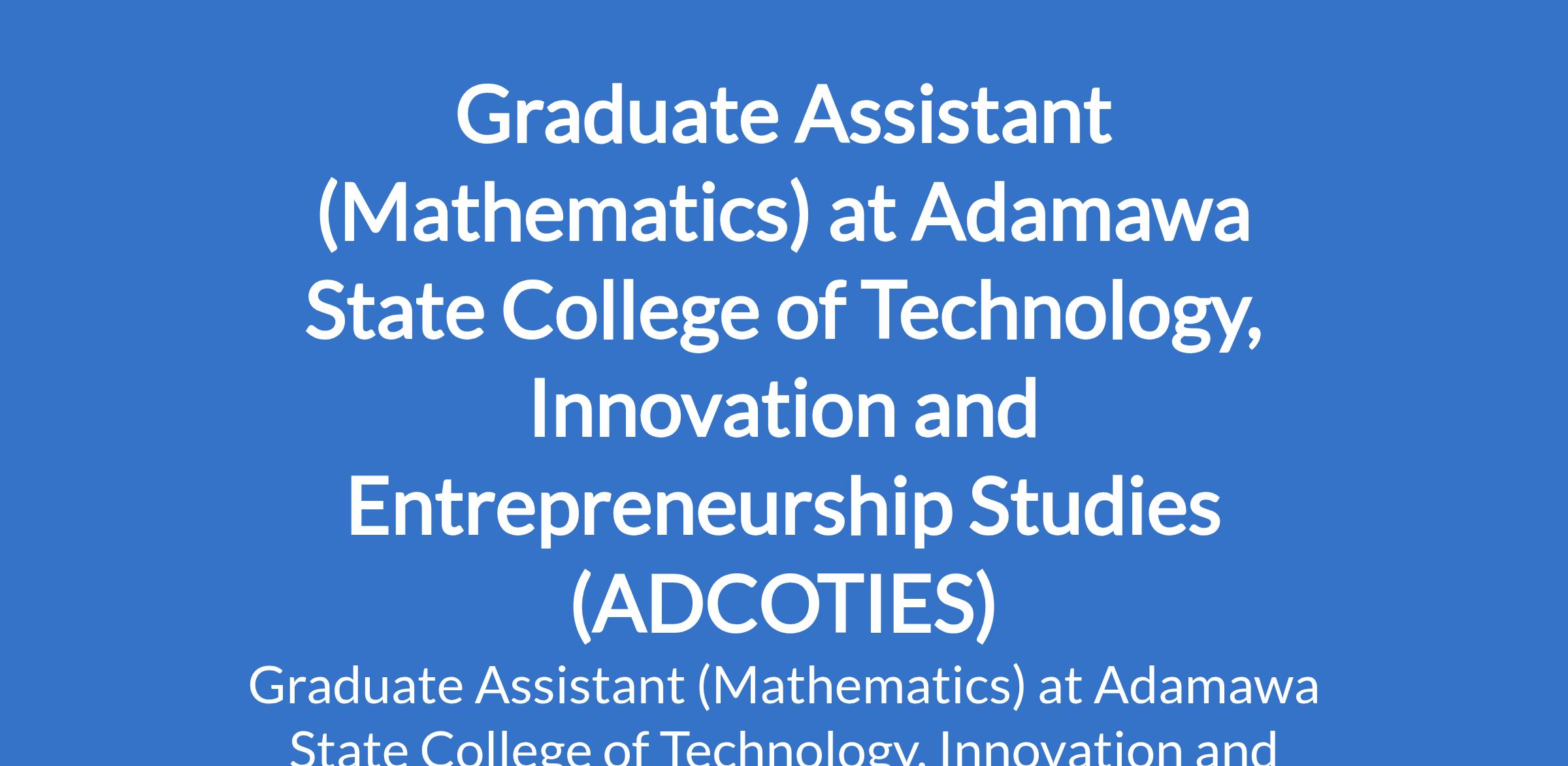Adamawa State College of Technology, Innovation and Entrepreneurship Studies (ADCOTIES) is recruiting to fill the position of: Graduate Assistant (Mathematics). The position is located in Gulak, Adamawa State. Interested candidates should possess a Bachelors Degree with a minimum of Second Class Upper or HND with Distinction from a recognized institution plus NYSC discharge or exemption certificate.