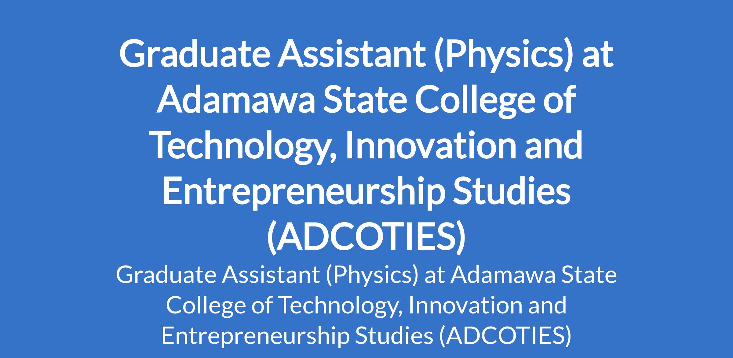Adamawa State College of Technology, Innovation and Entrepreneurship Studies (ADCOTIES) is recruiting to fill the position of: Graduate Assistant (Physics). The position is located in Gulak, Adamawa State. Interested candidates should possess a Bachelors Degree with a minimum of Second Class Upper or HND with Distinction from a recognized institution plus NYSC discharge or exemption certificate.