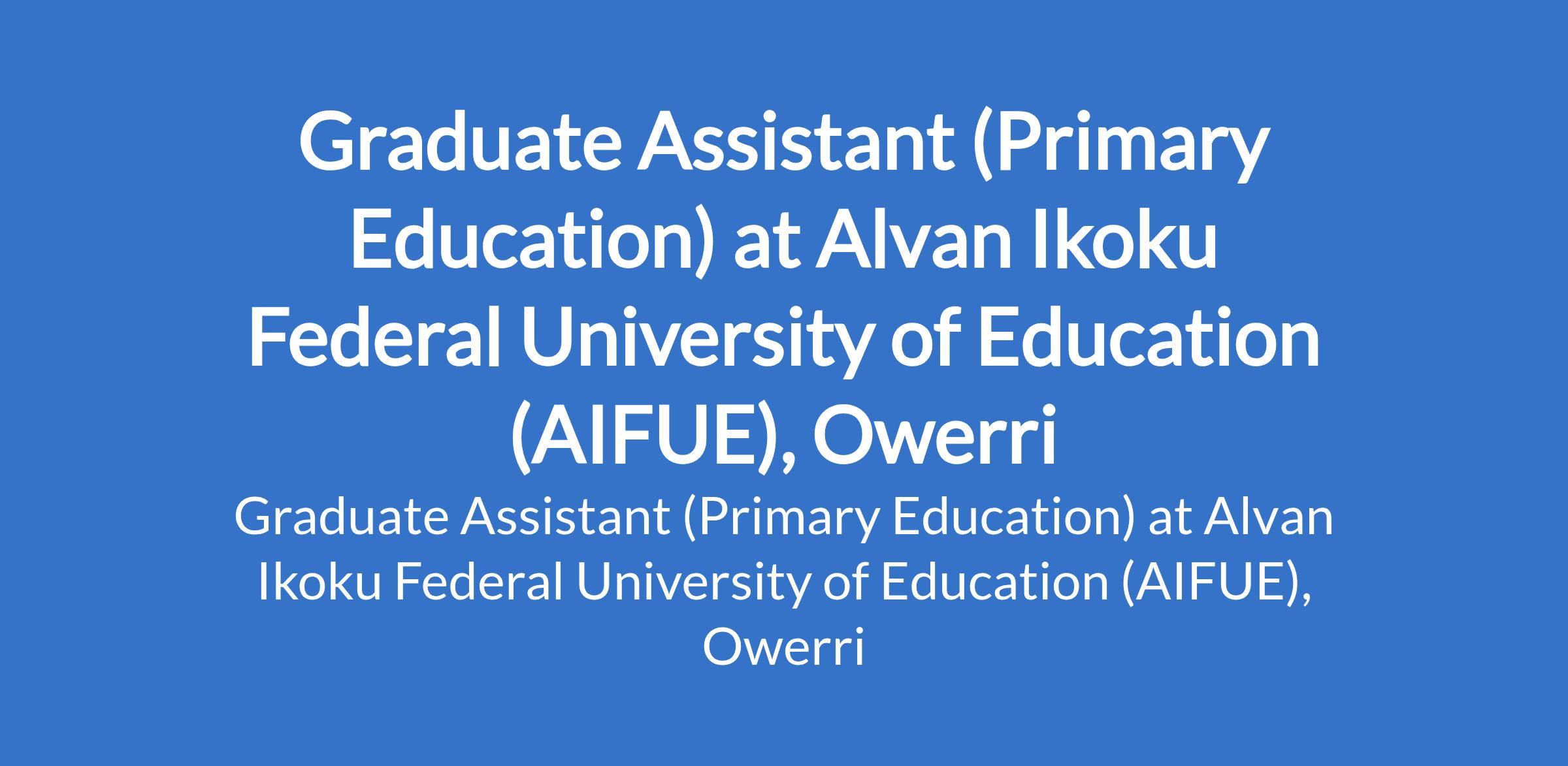 Alvan Ikoku Federal University of Education (AIFUE), Owerri invites applications from suitably qualified candidates for the position of: Graduate Assistant (Primary Education). The position is located in Imo State. Interested candidates should possess a First Degree in the relevant field from a recognized university with not less than Second Class Upper Division, and must show interest in pursuing an academic career.