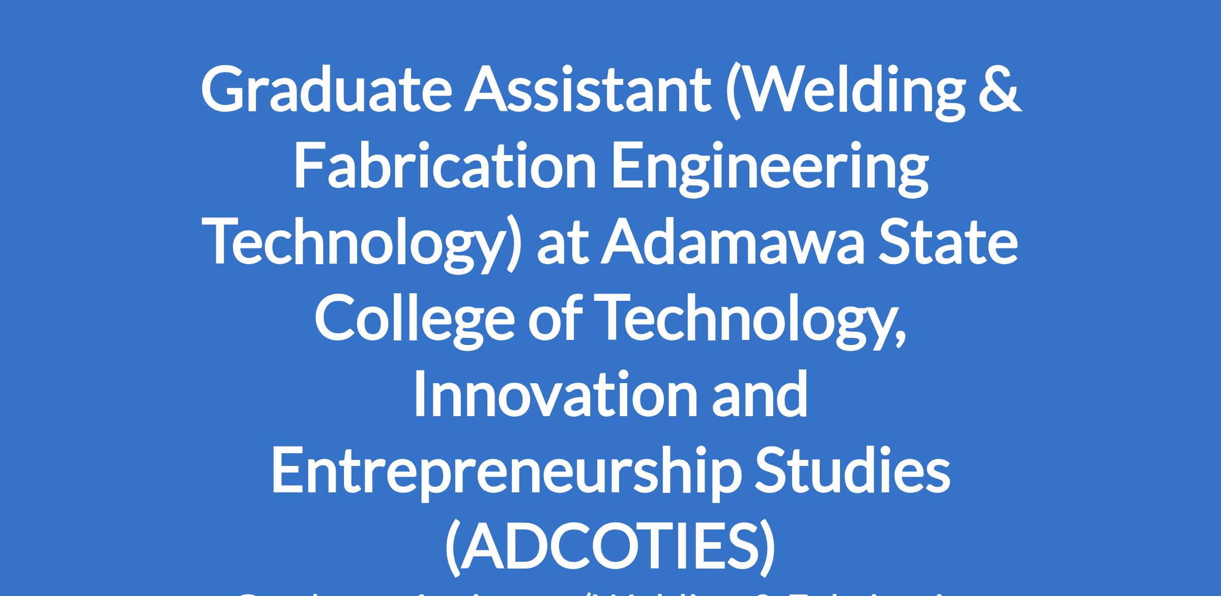 Adamawa State College of Technology, Innovation and Entrepreneurship Studies (ADCOTIES) is recruiting to fill the position of: Graduate Assistant (Welding & Fabrication Engineering Technology). The position is located in Gulak, Adamawa State. Interested candidates should possess a Bachelors Degree with a minimum of Second Class Upper or HND with Distinction from a recognized institution plus NYSC discharge or exemption certificate.