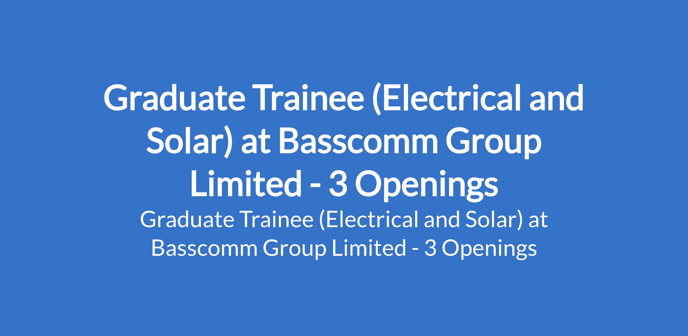 Basscomm Group Limited is recruiting to fill the position of: Graduate Trainee (Electrical and Solar). The position is located in Abuja (FCT), Lagos, & Rivers States. Interested candidates should possess a B.Sc / B.Eng. in Electrical / Electronic Engineering, ELVS, Renewable Energy, or related discipline.