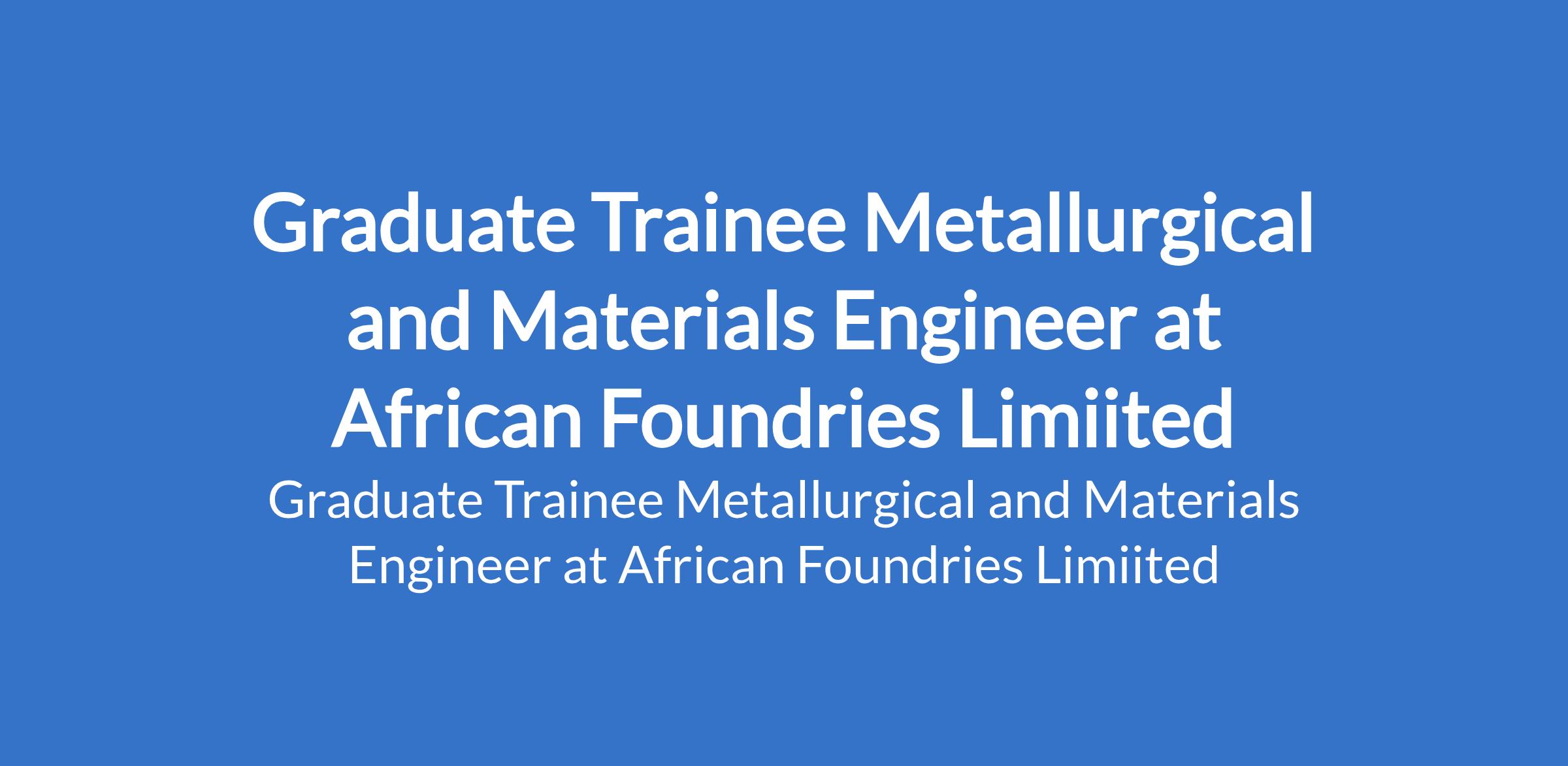 African Foundries Limiited is recruiting to fill the position of: Graduate Trainee Metallurgical and Materials Engineer. The position is located in Ogijo, Ogun State. Interested candidates should possess a Bachelors Degree in Metallurgical Engineering, Materials Science and Engineering, or related disciplines with 0 - 2 years of experience (entry-level role), and must have complete NYSC.