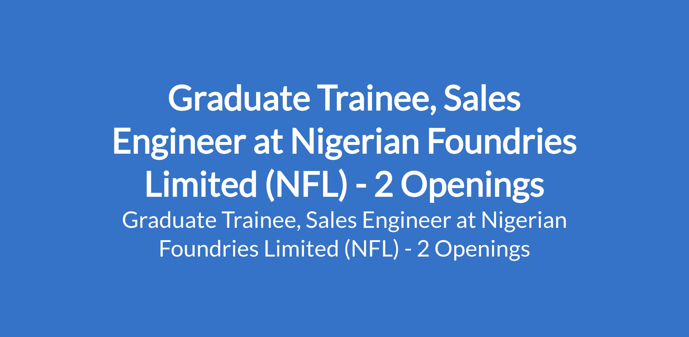 Nigerian Foundries Limited (NFL) is recruiting to fill the position of: Graduate Trainee, Sales Engineer. The position is located in Ota - Ogun, & Ilupeju - Lagos States. Interested candidates should possess a B.Sc / B.Eng / HND in Mechanical, Electrical/Electronics, Chemical, Metallurgical/Materials or related.