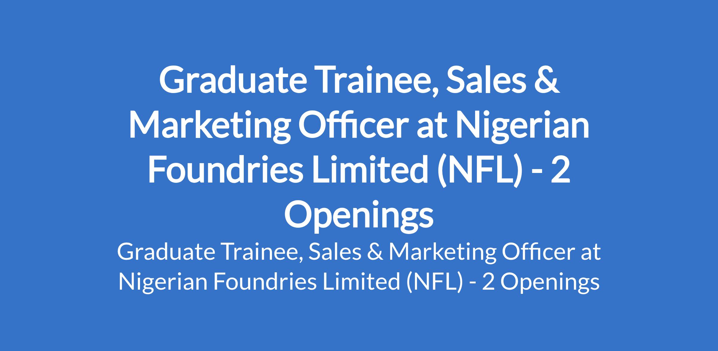 Nigerian Foundries Limited (NFL) is recruiting to fill the position of: Graduate Trainee, Sales & Marketing Officer. The position is located in Ota - Ogun, & Ilupeju - Lagos States. Interested candidates should possess a B.Sc / HND in Marketing or any Social Science (Engineering graduates interested in technical sales may apply).