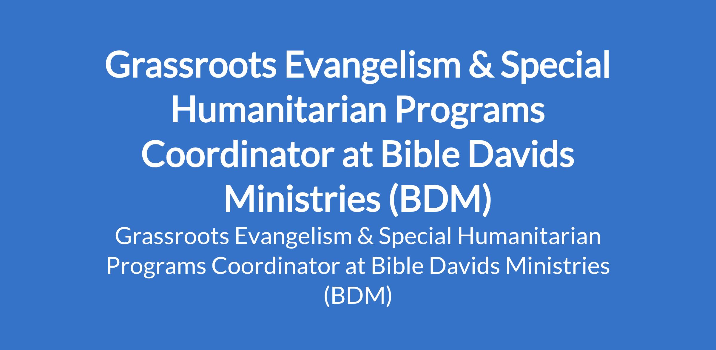 Bible Davids Ministries (BDM) is recruiting to fill the position of: Grassroots Evangelism & Special Humanitarian Programs Coordinator. The position is located in Abuja. Interested candidates should possess a Bachelors Degree in Ministry, Social Work, Public Administration, Development Studies, or a related field with 35 years of experience in evangelism, humanitarian work, NGO programs, or community outreach.