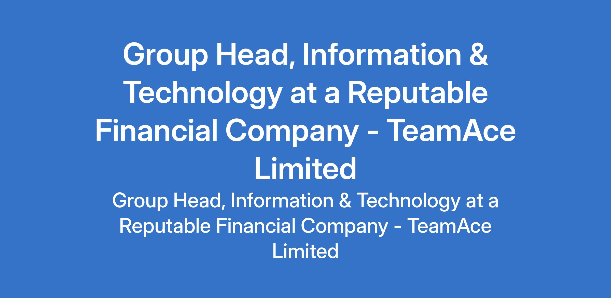 TeamAce Limited - Our client, a reputable organization in the financial services sector is recruiting to fill the position of: Group Head, Information & Technology. The position is located in Victoria Island, Lagos State. Salary: NGN 1,170,000 - NGN 2,250,000 monthly. Interested candidates should possess a Bachelor's Degree in Computer Science, Engineering, or a related field (Master's Degree is an advantage) with 810 years experience in software engineering or senior technology leadership within financial services, fintech, banking, or payments.
