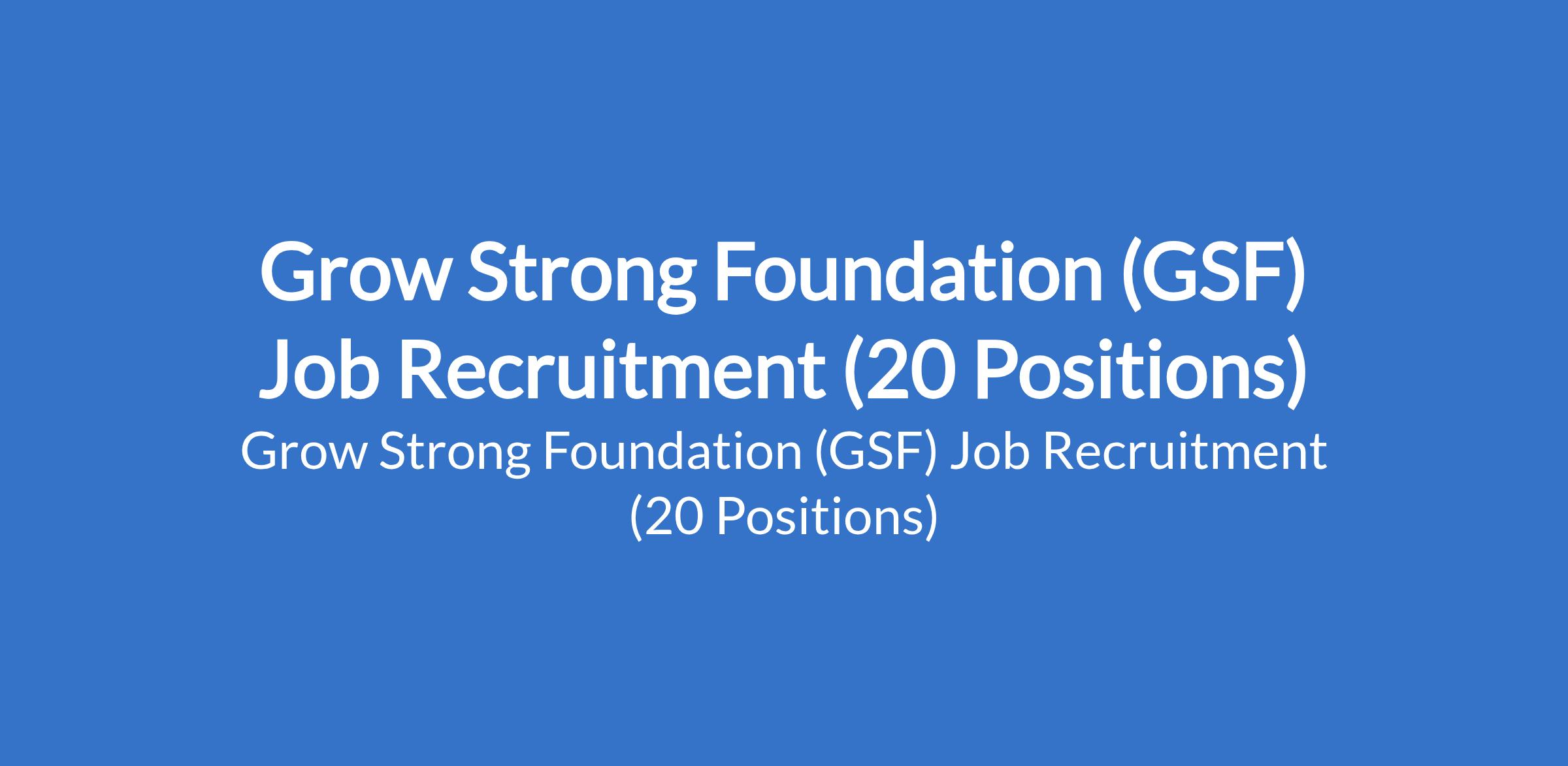 Grow Strong Foundation (GSF) is recruiting suitably qualified candidates to fill the following positions in Borno and Yobe States: MHPSS Officer (Mental Health and Psychosocial Support), Project Coordinator, Finance Officer, MEAL Officer, Case Management Officer (CMO), Accountability Officer, Auditor, Procurement Officer, Inclution Officer, Gender-Based Violence (GBV) Officer, ICT Officer, Nutrition Officer, Traditional Justice Officer, Case worker, Psychosocial Support (PSS) Facilitator, Logistics & Security Officer, Child-Friendly Space (CFS) Animator, Community Mobilizer, Protection Monitor, and Child Protection Officer.