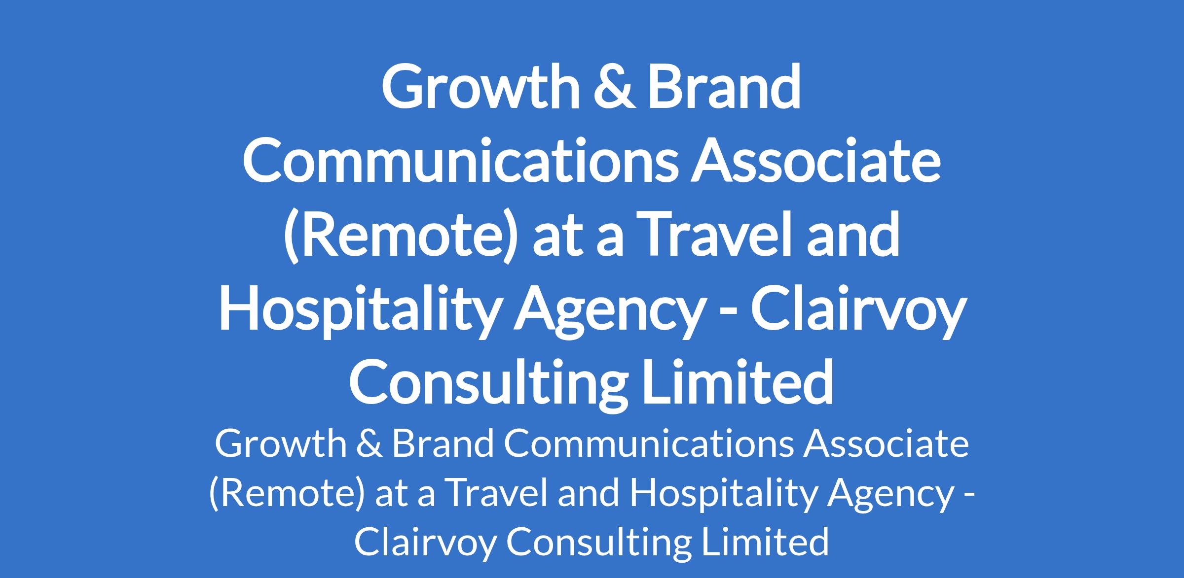 Clairvoy Consulting Limited - Our client, a travel and hospitality agency is recruiting to fill the position of: Growth & Brand Communications Associate. This is a remote job. Salary: N100,000 Monthly. Interested candidates should possess a Bachelors Degree in Mass Communication, Digital Marketing, Public Relations, or related fields with 2 years of experience in digital marketing, content strategy, or brand communications, and must have a portfolio of successful campaigns or brand growth.