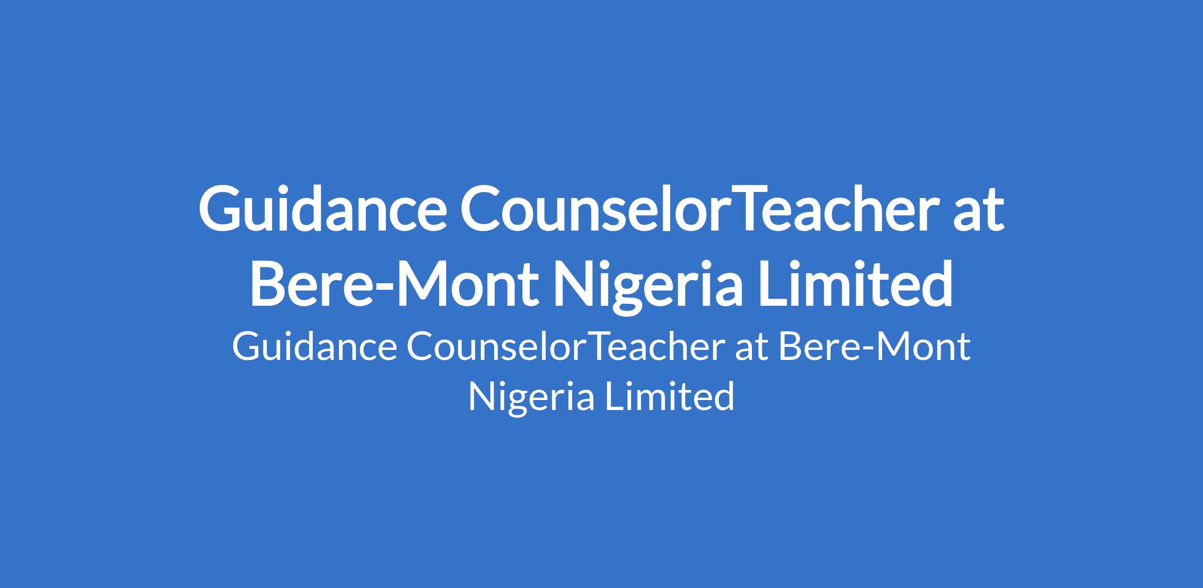 Bere-Mont Nigeria Limited is recruiting to fill the position of: Guidance CounselorTeacher. Interested candidates should possess a B.Sc / B.Sc + NCE / B.Sc (Ed) / B.Ed / PGDE / M.Ed; Must be a registered member of Teachers Registration Council of Nigeria with a minimum of 3 years of teaching experience in the area of specialization.