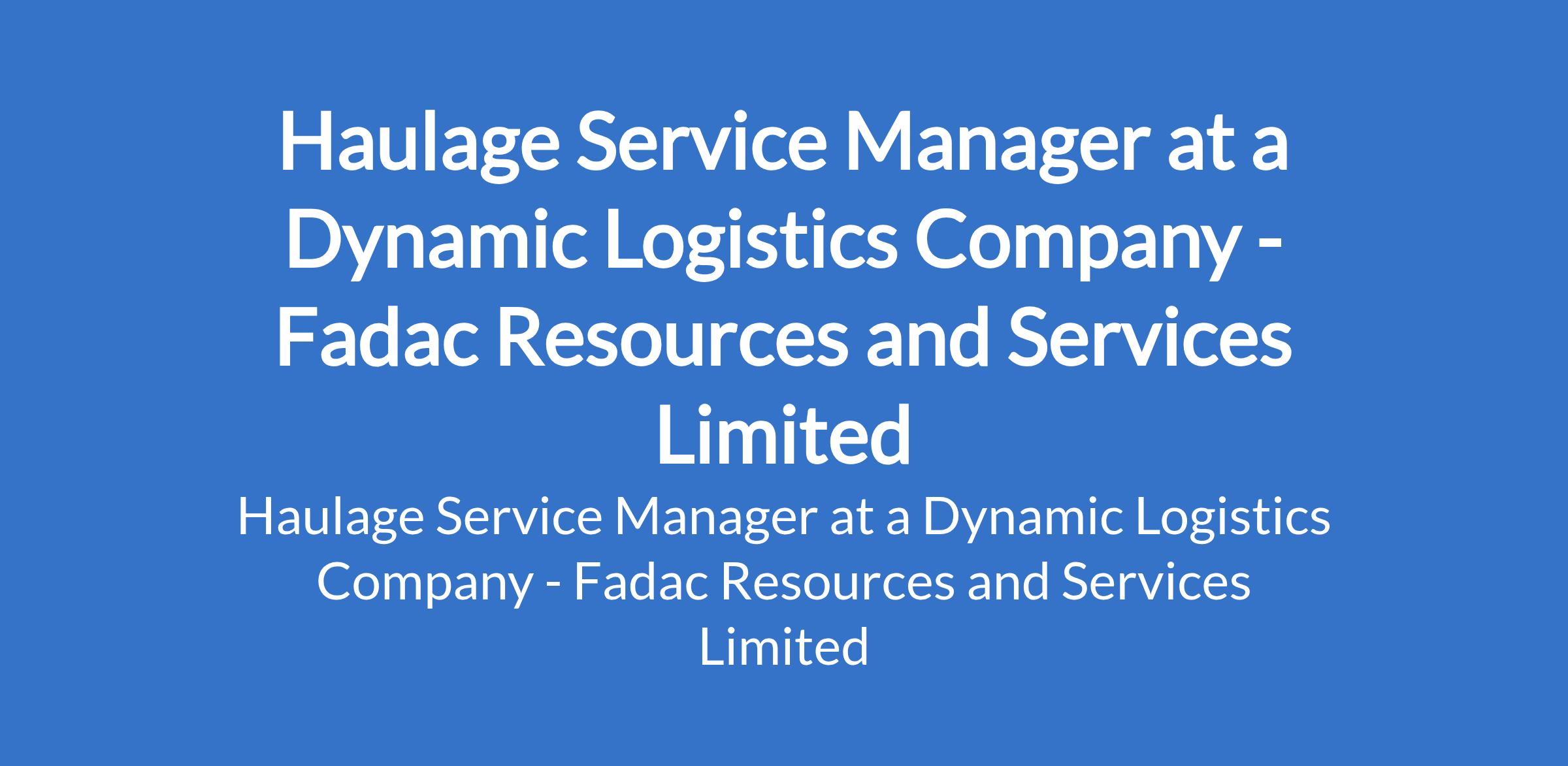 Fadac Resources and Services Limited - Our client in the dynamic logistics industry, is recruiting to fill the position of: Haulage Service Manager. The position is located in Lagos State. Interested candidates should possess minimum of a BSc / Master`s Degree in in Transport Management or any field with up to 8 years previous Haulage experience.