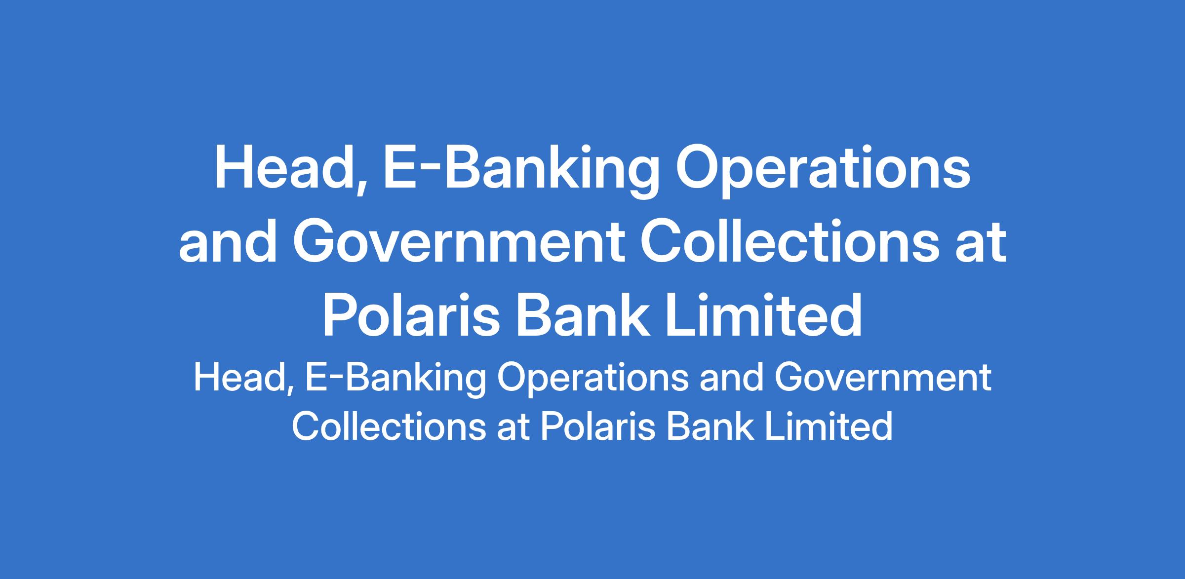 Polaris Bank Limited is recruiting to fill the position of: Head, E-Banking Operations and Government Collections at Polaris Bank Limited. The position is located in Lagos State. Interested candidates should possess relevant qualifications with a minimum of 6 years of experience in a similar e-banking or digital operations role within a commercial bank.