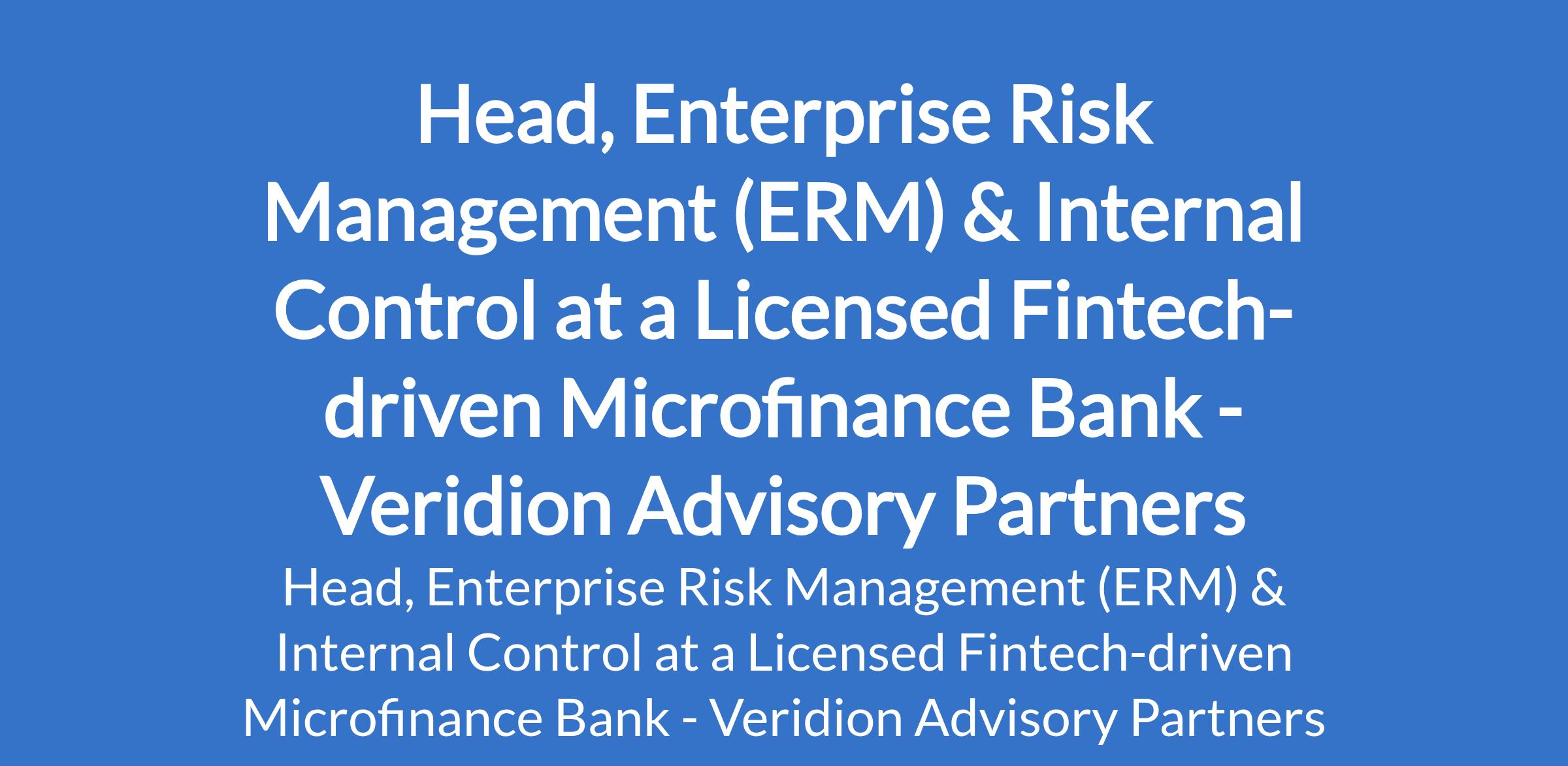 Veridion Advisory Partners - Our client, a Licensed Fintech-driven Microfinance bank is recruiting to fill the position of: Head, Enterprise Risk Management (ERM) & Internal Control. The position is located in Lagos State. Interested candidates should possess a Bachelors Degree in Accounting, Finance, Economics, Banking, or related discipline with a minimum of 12 years progressive experience in Risk Management, Internal Control, Internal Audit, or Compliance within banking or fintech institutions.