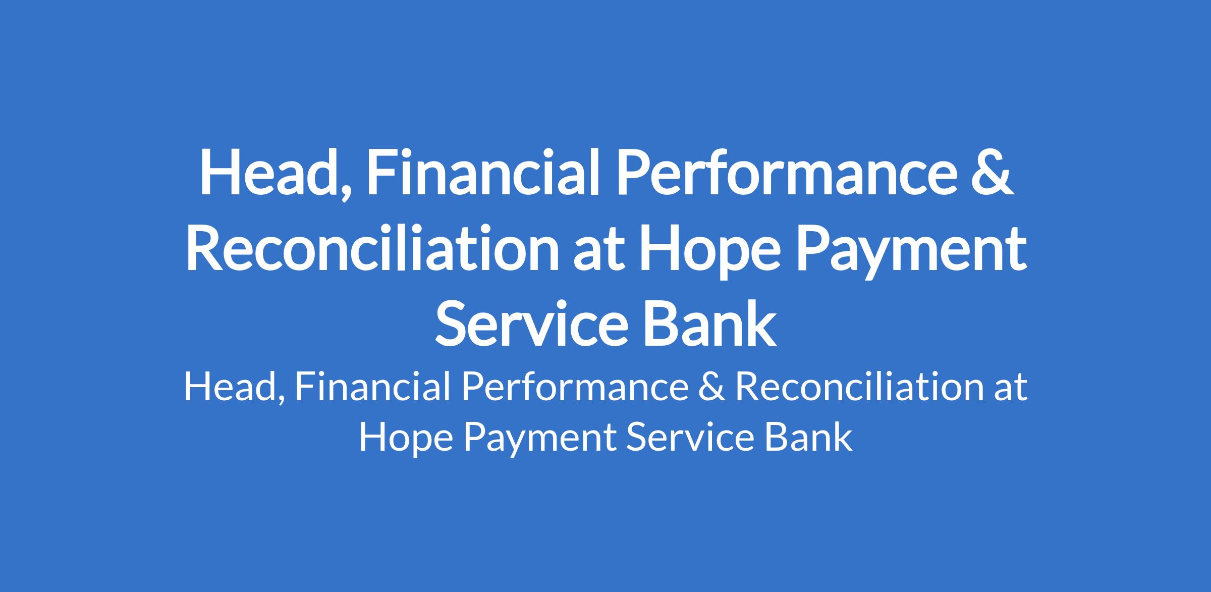 Hope Payment Service Bank is recruiting to fill the position of: Head, Financial Performance & Reconciliation. The position is located in Lagos State. Interested candidates should possess a Degree / qualification in Accounting, Finance, Economics, Engineering, Statistics, Mathematics with a minimum of 10 years relevant experience Financial Services sector.