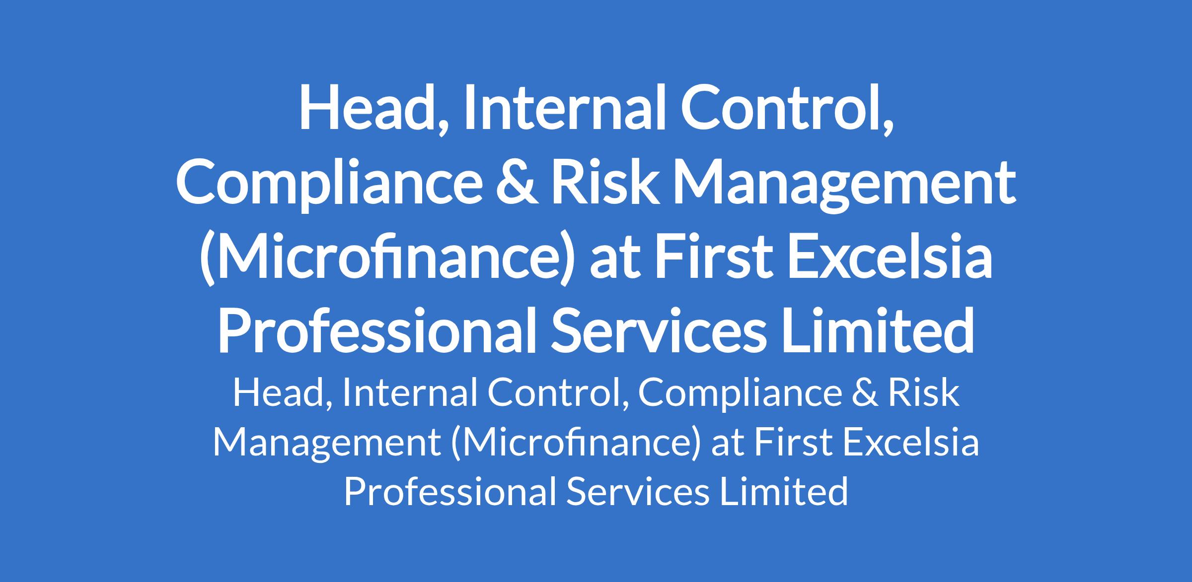 First Excelsia Professional Services Limited is recruiting to fill the position of: Head, Internal Control, Compliance & Risk Management (Microfinance). The position is located in Surulere, Lagos State. Salary: N21,000,000 - N25,000,000 annually. Interested candidates should possess a Bachelors Degree in Accounting, Finance, Economics, or related fields and a professional certification (ACA, ACCA, CIBN), with 10 15 years relevant experience in Internal Control, Compliance & Risk Management.