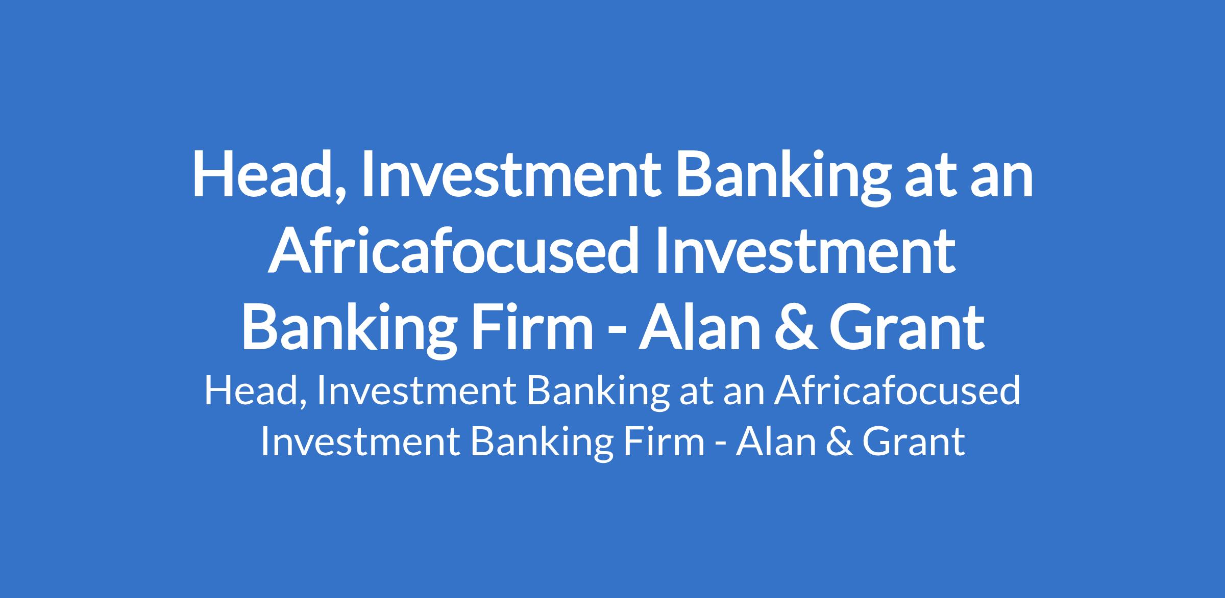 Alan & Grant - Our client, an Africafocused investment banking firm is recruiting to fill the position of: Head, Investment Banking. The position is located in Lagos State. Interested candidates should possess relevant qualifications with 15+ years of professional experience in an investment bank, private equity firm, commercial bank or investment banking boutique.