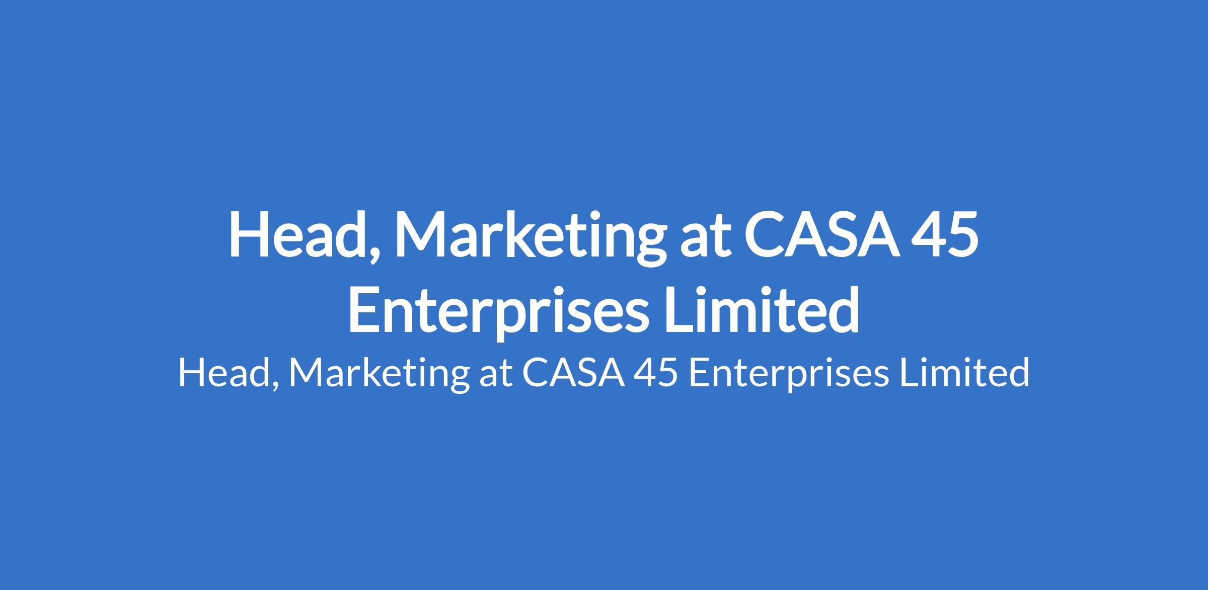 CASA 45 Enterprises Limited is recruiting to fill the position of: Head, Marketing. The position is located in Victoria Island, Lagos State. Salary: N600,000 - N650,000 monthly. Interested candidates should possess a Bachelor`s Degree with 3 - 5 years experience.