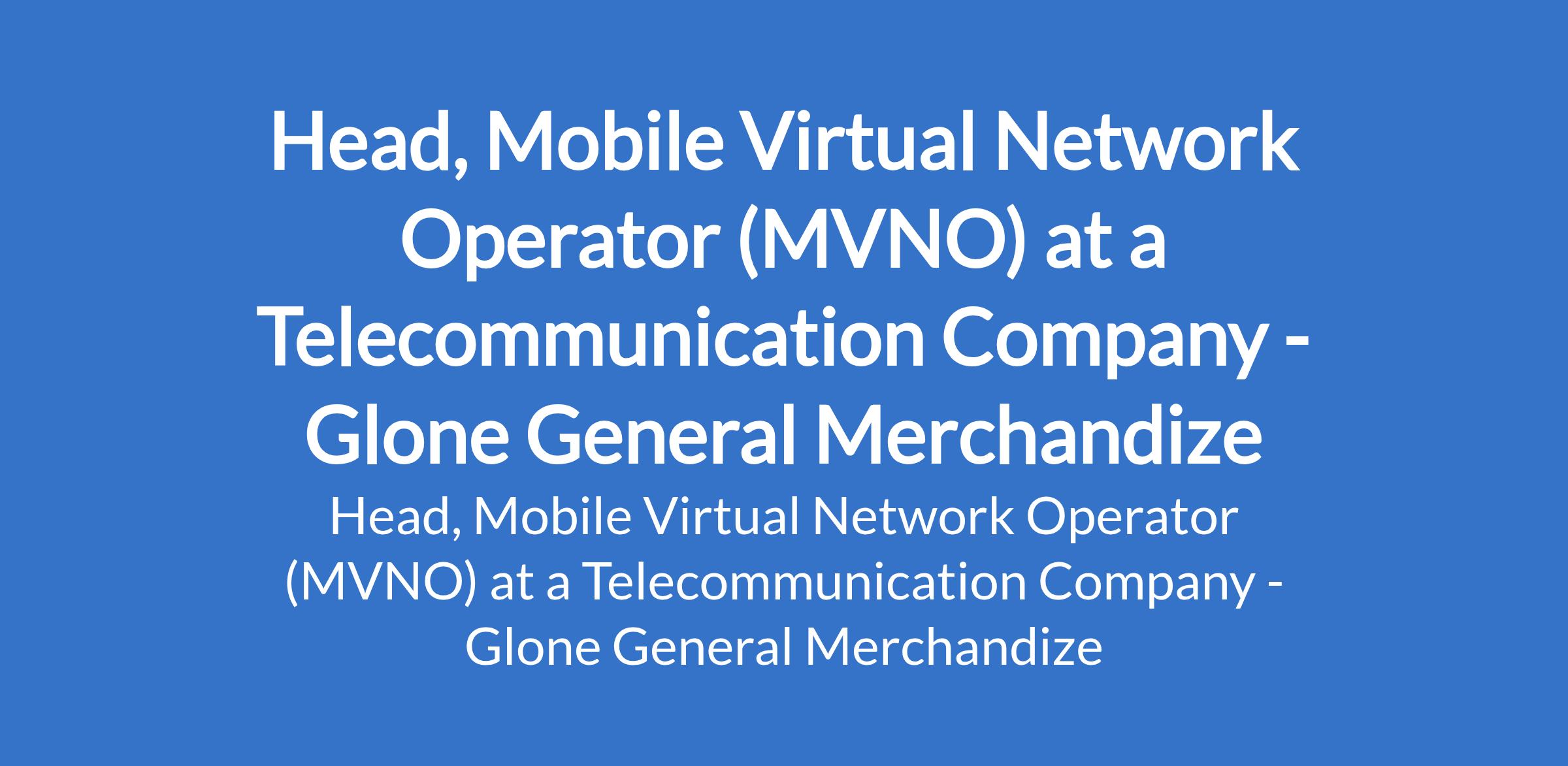 Glone General Merchandize - Our client, a Telecommunication Company is recruiting to fill the position of: Head, Mobile Virtual Network Operator (MVNO). The position is located in Lagos State. Interested candidates should possess a Bachelors Degree in Business, Marketing, Engineering, Computer Science, or related field; MBA or Masters Degree is an advantage with 10 15 years experience in Telecoms, MVNO/MVNE, or FMCG.