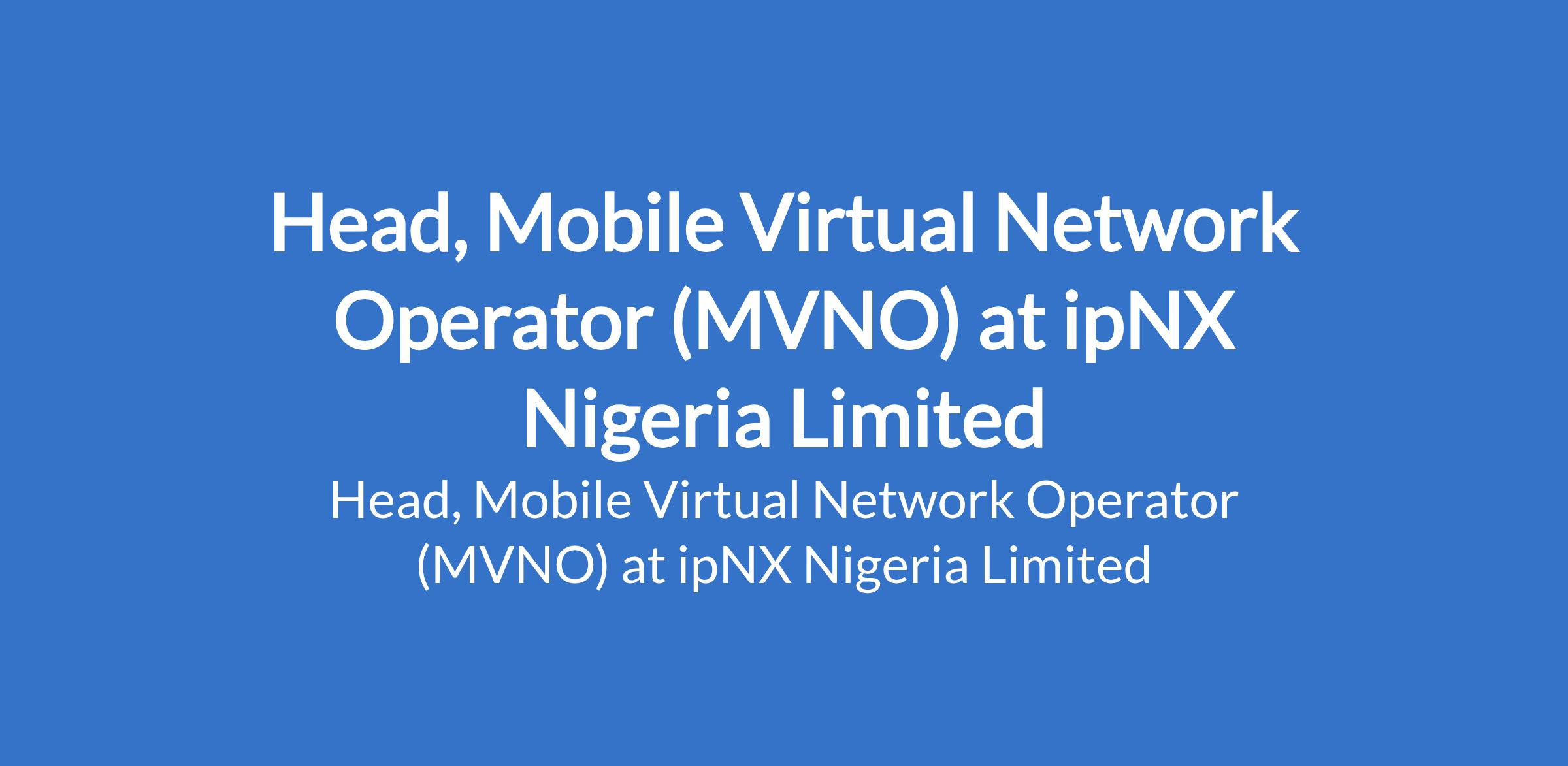 ipNX Nigeria Limited is recruiting to fill the position of: Head, Mobile Virtual Network Operator (MVNO). The position is located in Lagos State. Salary: N1,000,000 - N2,000,000 Monthly. Interested candidates should possess a Bachelor's Degree (minimum 2.1) in Business, Engineering, Marketing, or related fields with 1015 years in the telecoms ecosystem with direct MVNO / MVNE / MNO experience.