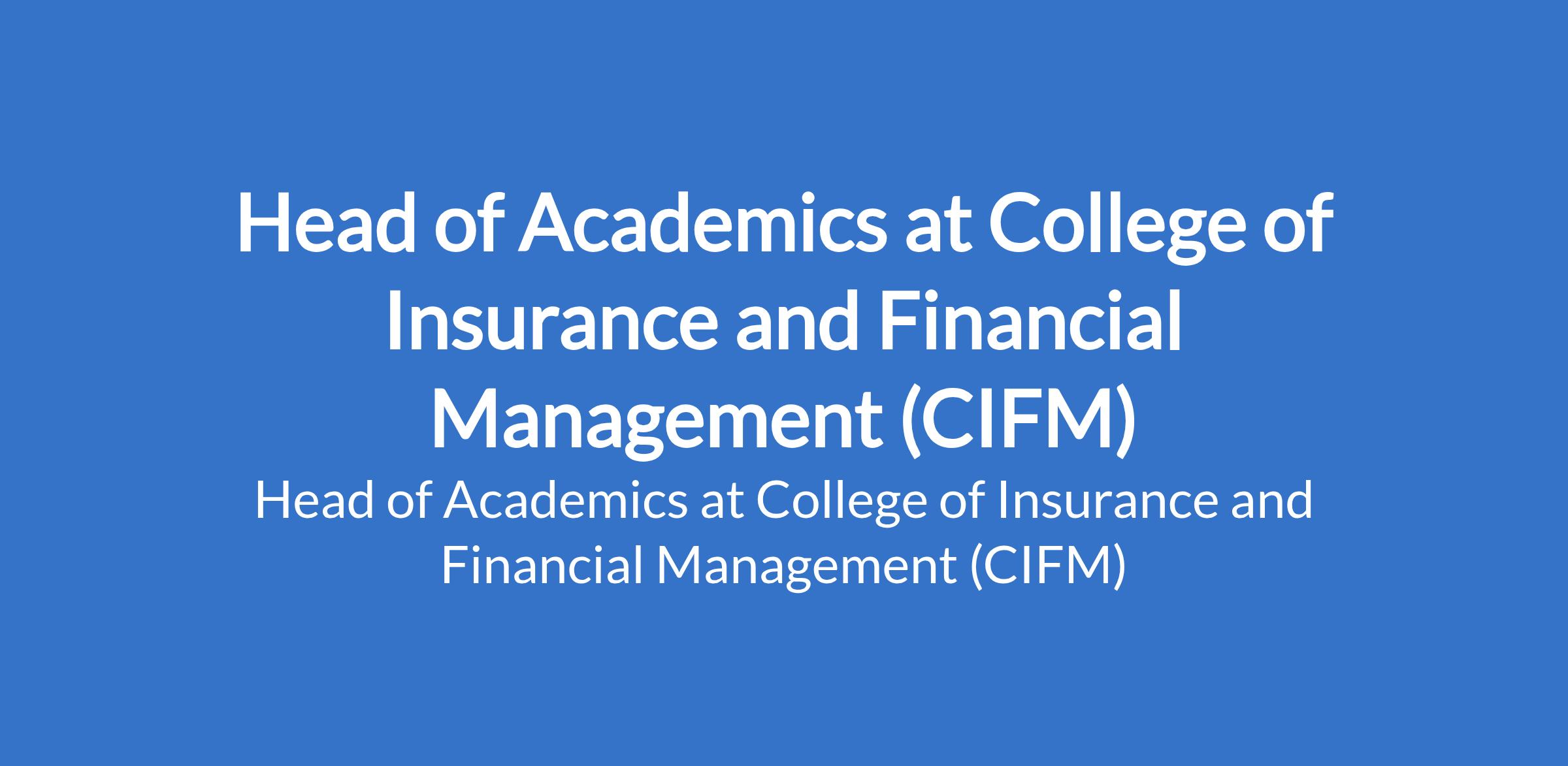 The College of Insurance and Financial Management (CIFM) is recruiting to fill the position of: Head of Academics. Interested candidates should possess a Masters or Doctorate in Insurance, Finance, Business Administration or related discipline with 1015 years of academic / industry experience.