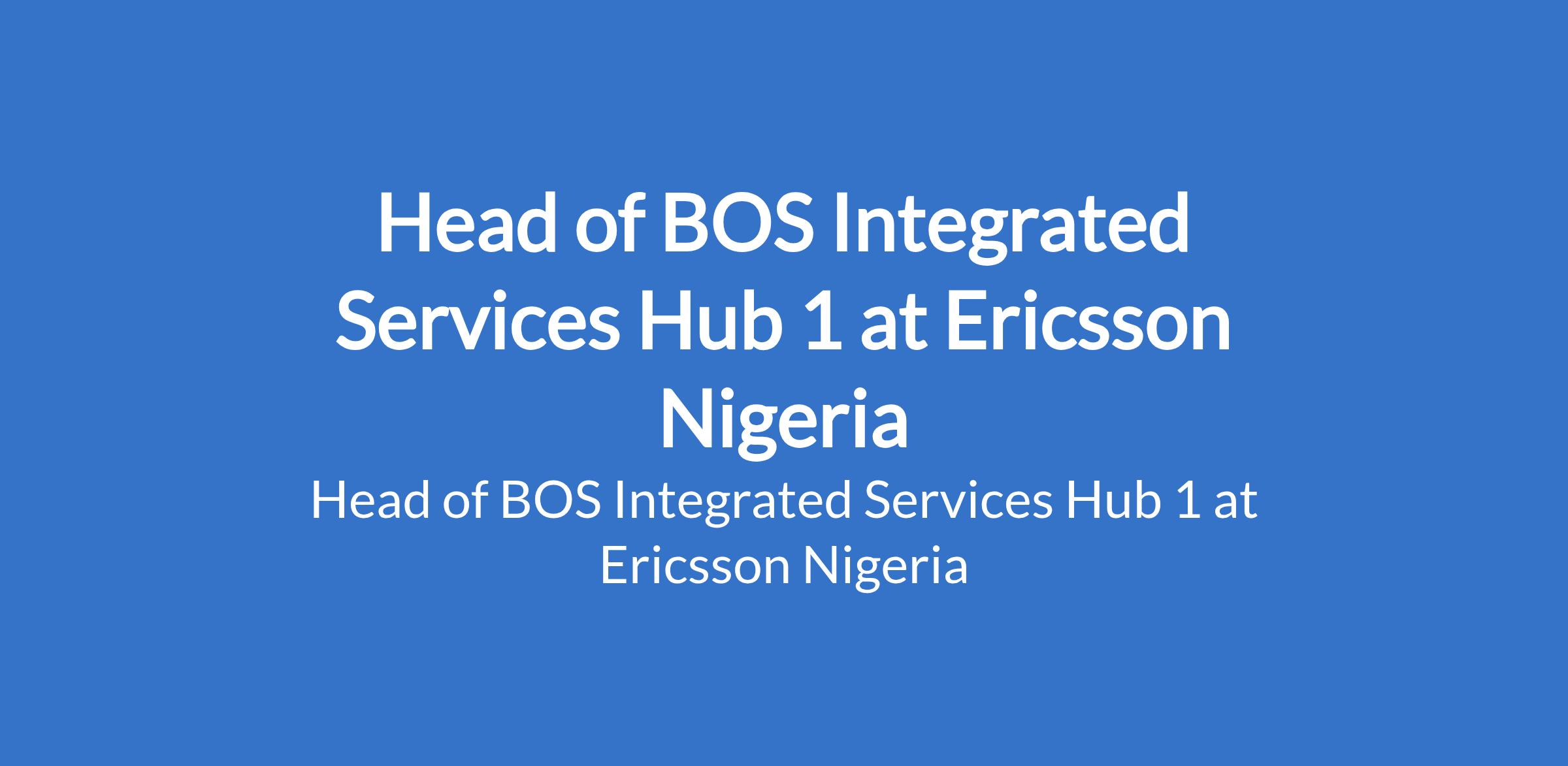 Ericsson Nigeria is recruiting to fill the position of: Head of BOS Integrated Services Hub 1. The position is located in Abuja. Interested candidates should possess a University Degree in ICT / Engineering with 12+ years of experience in telecom industry with leadership track record in professional services including system integration, application development & maintenance, and IT managed services.program delivery.