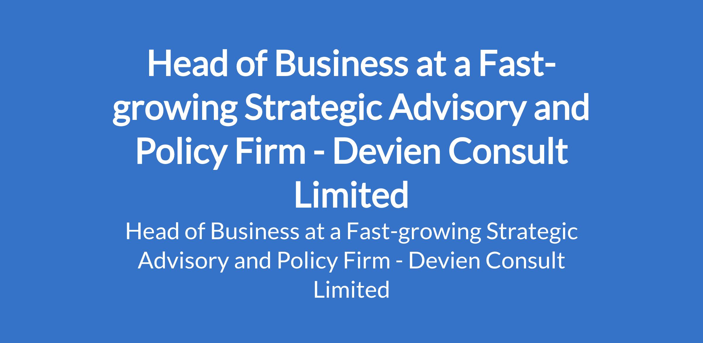Devien Consult Limited - Our client, a fast-growing strategic advisory and policy firm is recruiting to fill the position of: Head of Business. The position is located in Abuja. Interested candidates should possess a relevant qualification with 812 years experience in operations, consulting, financial services, or related fields.