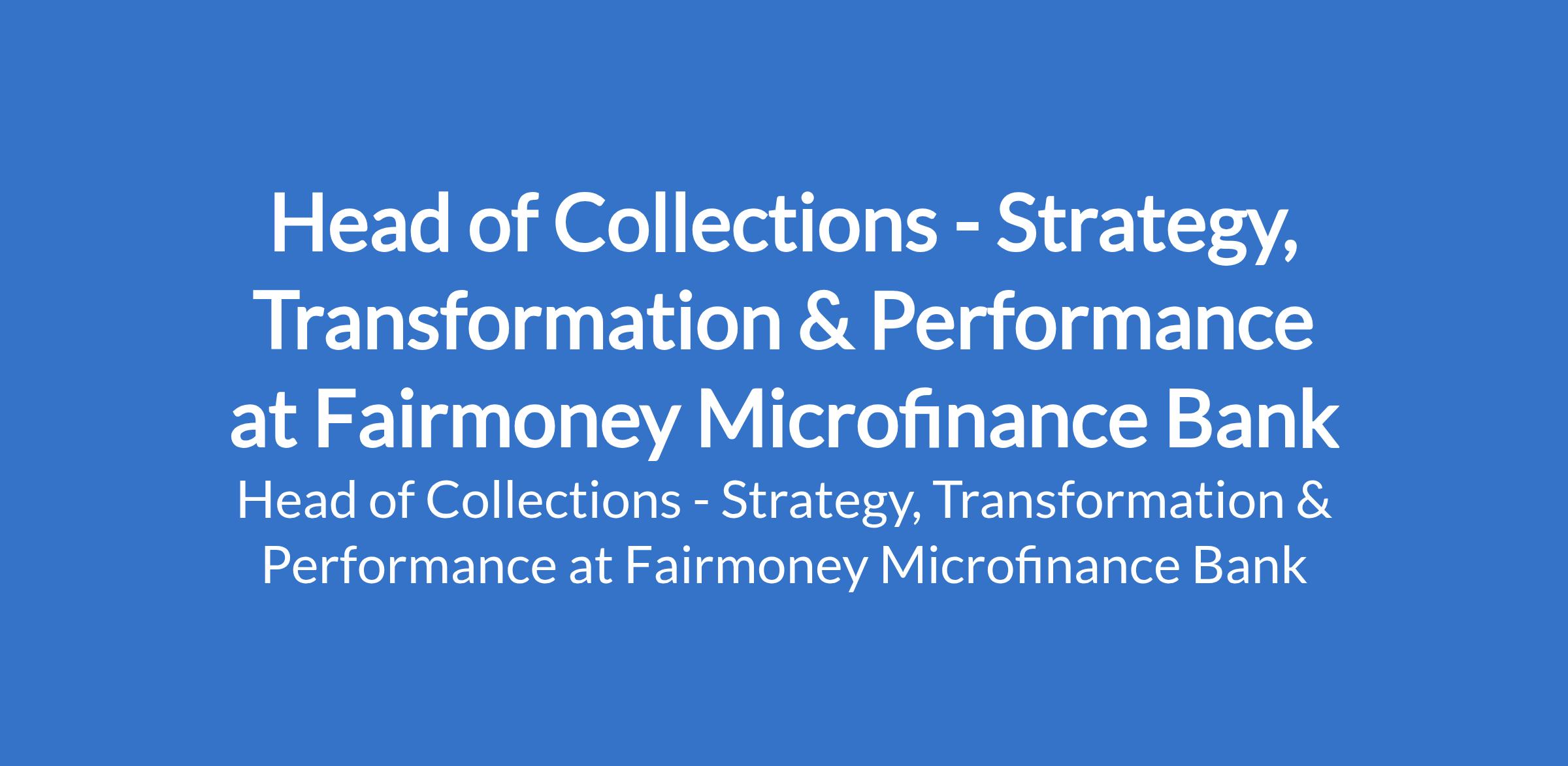 Fairmoney Microfinance Bank is recruiting to fill the position of: Head of Collections - Strategy, Transformation & Performance. The position is located in Lagos State. Interested candidates should possess a minimum of First Degree in any related field of study with senior leadership experience in collections within lending, fintech, or credit-led businesses with a minimum of 8 years proven experience in Collections with good leadership experience.