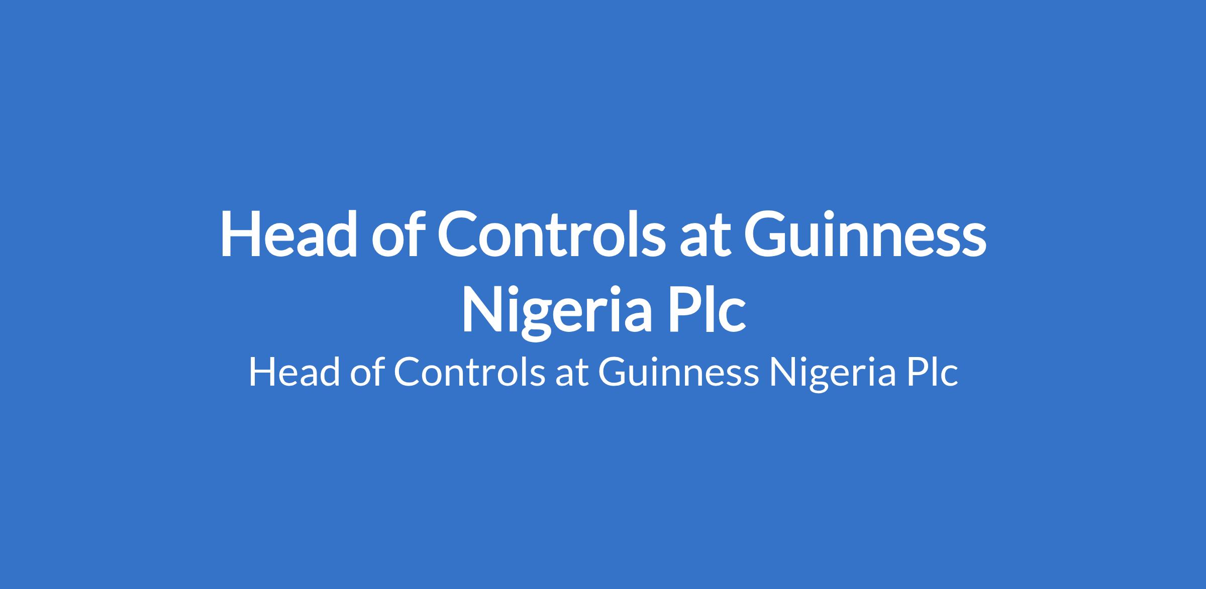 Guinness Nigeria Plc, a subsidiary of Diageo is recruiting to fill the position of: Head of Controls. The position is located in Ikeja, Lagos State. Interested candidates should possess a Chartered Accountant / ACCA / CPA (or equivalent) qualification with 812+ years experience in internal controls, audit, or finance.