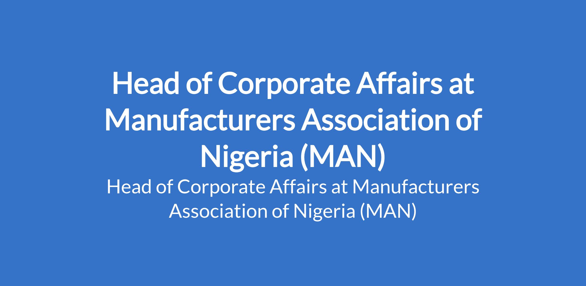 Manufacturers Association of Nigeria (MAN) is recruiting to fill the position of: Head of Corporate Affairs. The position is located in Lagos State. Interested candidates should possess relevant qualifications.