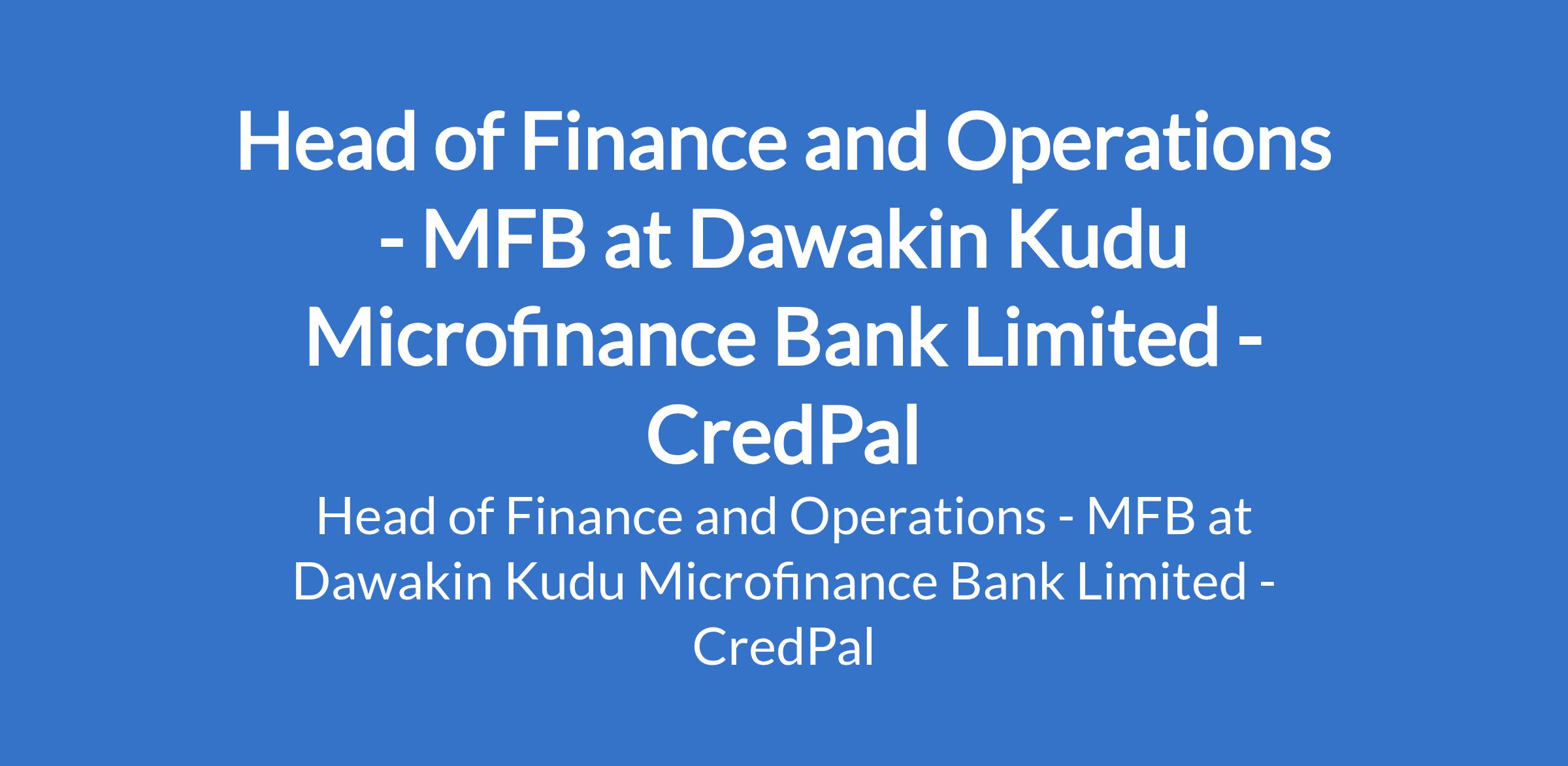 Dawakin Kudu Microfinance Bank Limited a sister company of Credpal is recruiting to fill the position of: Head of Finance and Operations - MFB. The position is located in Kano State. Interested candidates should possess a Bachelors Degree in Finance, Accounting, Economics, or related field with a minimum of 5 years experience strictly within a Microfinance Bank (MFB) with at least 3 years in a senior leadership role overseeing finance and/or operations and must reside in Kano State, preferably within or around Dawakin Kudu and its environs.