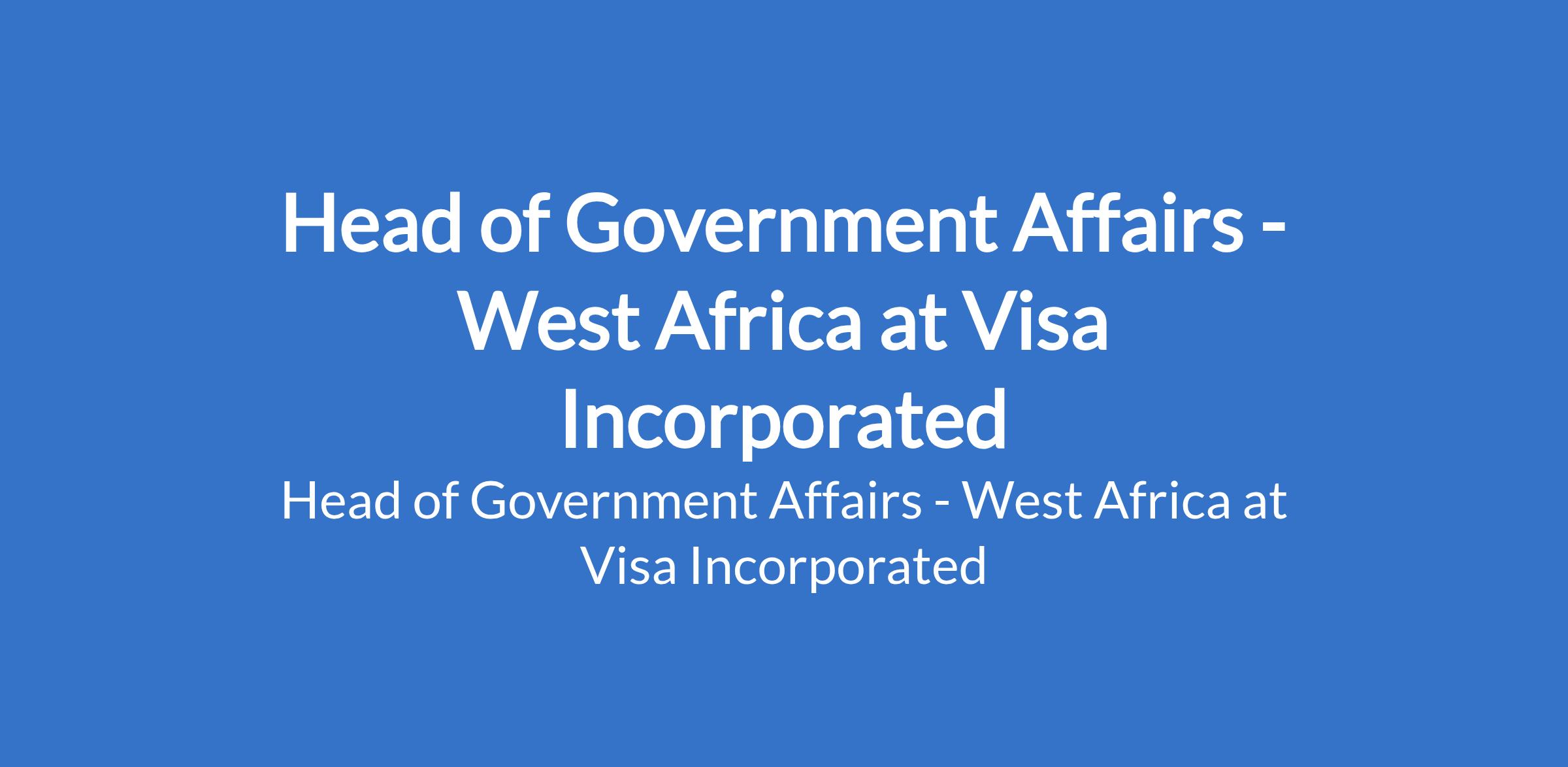 Visa Incorporated is recruiting to fill the position of: Head of Government Affairs - West Africa. The position is located in Lagos State. Interested candidates should possess a Bachelors Degree with 8+ years of relevant work experience, an Advanced Degree with at least 5 years of experience or a PhD Degree with 2 years experience.
