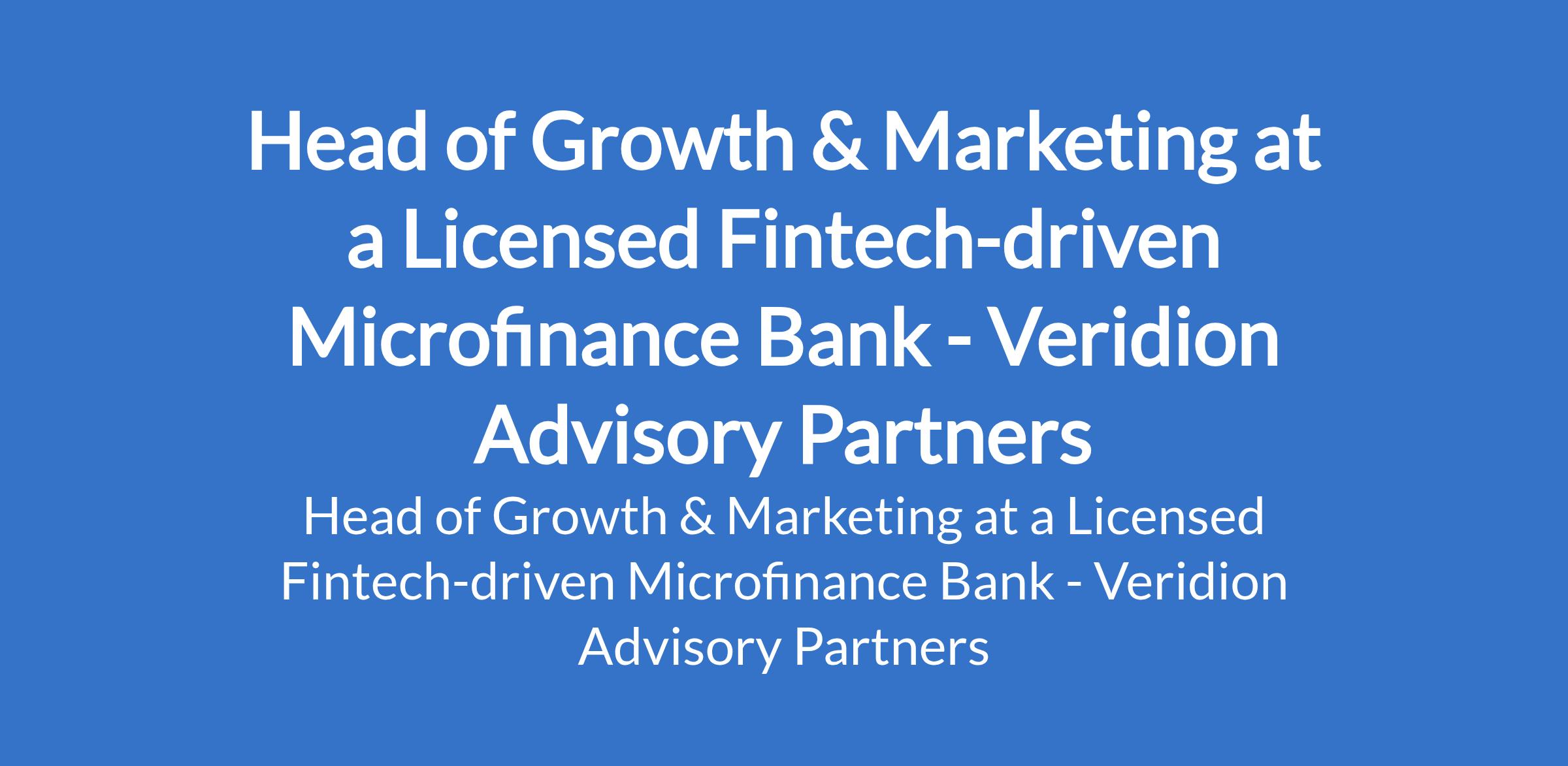Veridion Advisory Partners Our client, a licensed fintech-driven microfinance bank is recruiting to fill the position of: Head of Growth & Marketing. The position is located in Lagos State. Salary: N600,000 - N1,000,000 / month. The role is responsible for building scalable growth channels that drive retail deposits, SME deposits, savings accounts, and fixed deposit portfolios. Interested candidates should possess a Bachelors Degree in Marketing, Business Administration, Economics, Finance, or a related field with a minimum of 12 years experience in banking, fintech, or financial services growth roles.