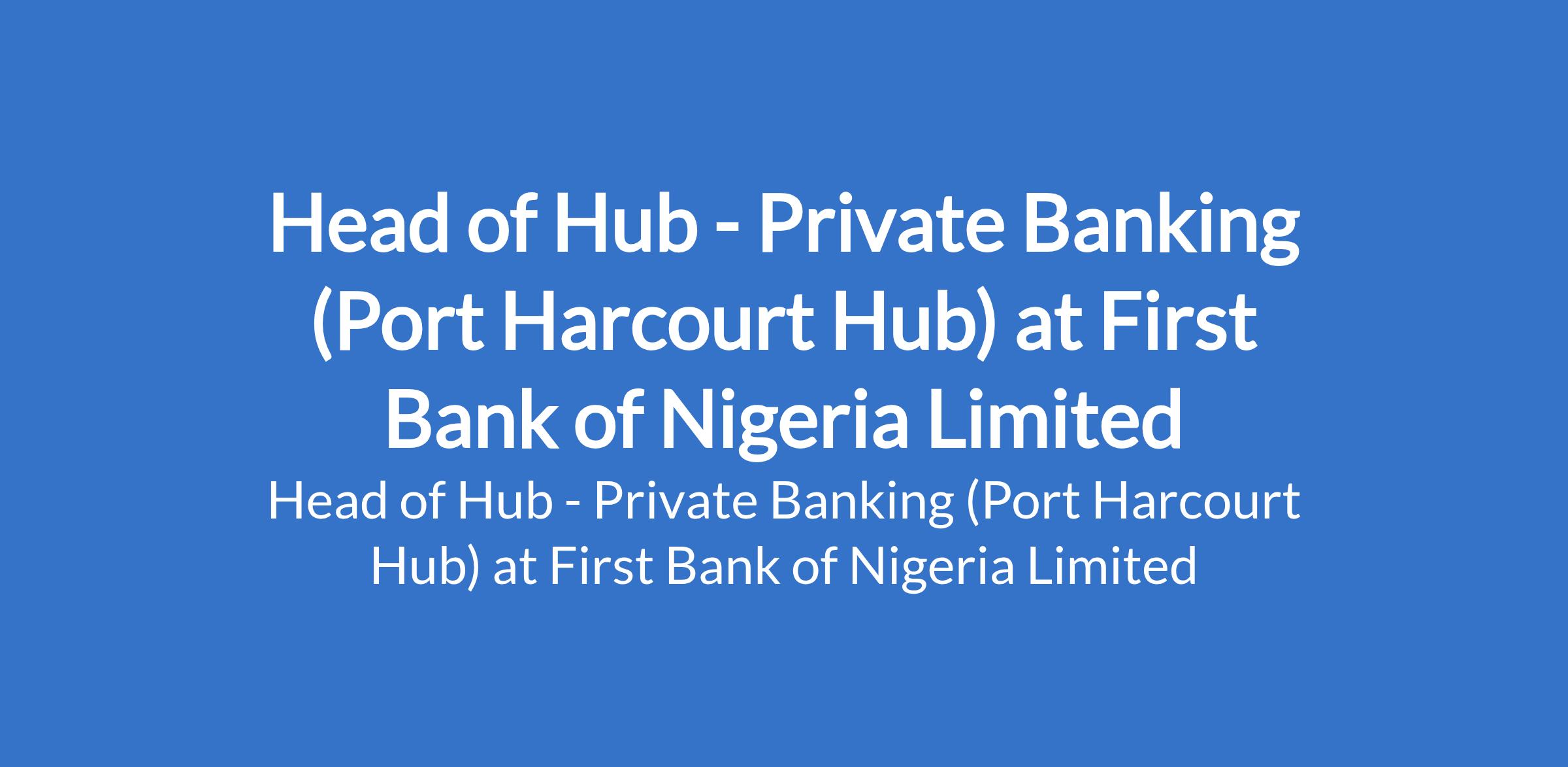 First Bank of Nigeria Limited is recruiting to fill the position of: Head of Hub - Private Banking. The position is located in Port Harcourt, Rivers State. Interested candidates should possess a minimum of 2:2 undergraduate Degree with a minimum of 10 years working experience in banking or a related industry.