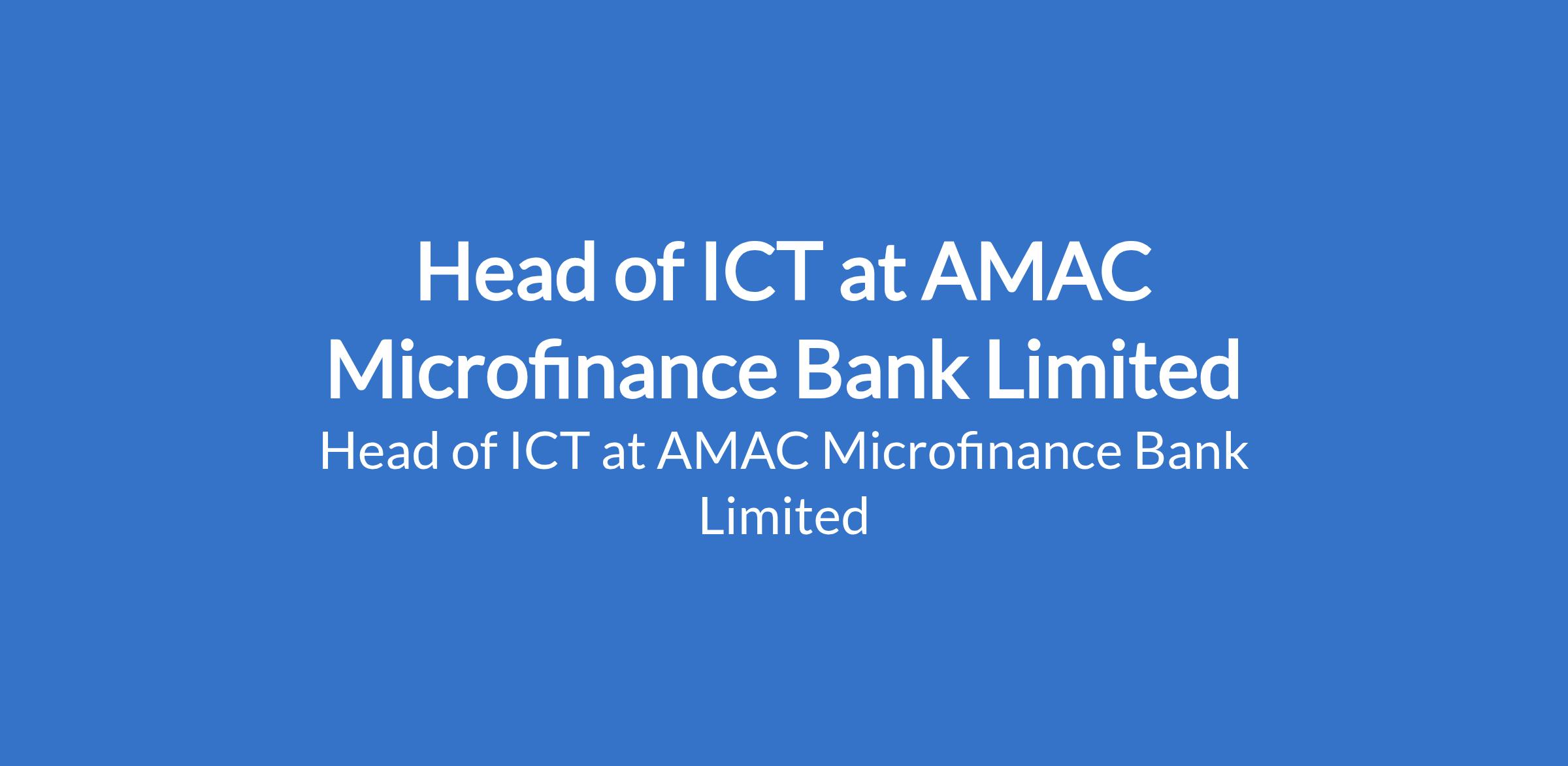 AMAC Microfinance Bank Limited is recruiting to fill the position of: Head of ICT. The position is located in Abuja (FCT). Interested candidates should possess a Bachelors Degree in Computer Science, Information Technology, or a related field and 5 - 8 years of ICT experience, with at least 3 years in a leadership role.