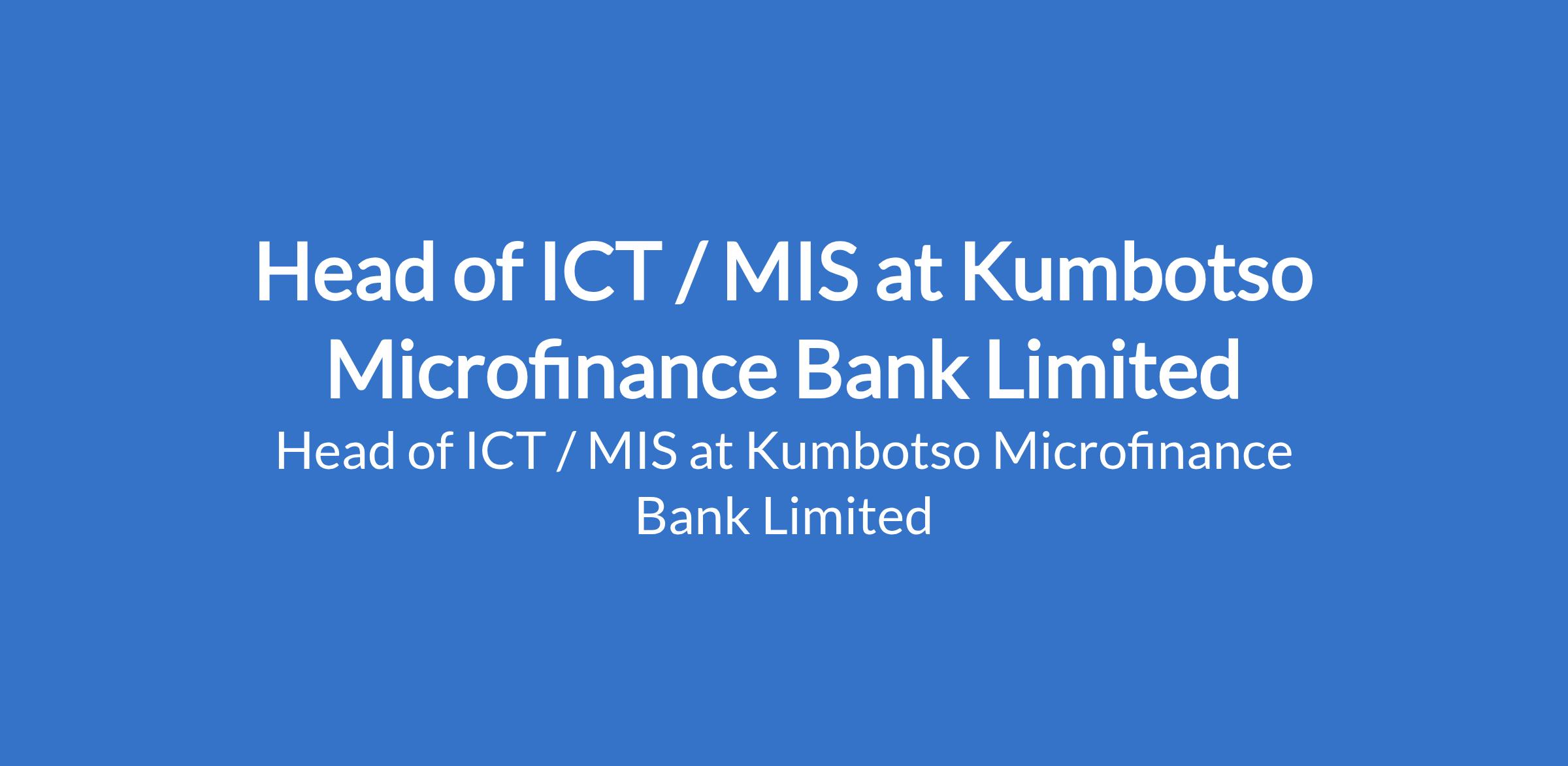 Kumbotso Microfinance Bank Limited is recruiting to fill the position of: Head of ICT / MIS. The position is located in Kano State. Interested candidates should possess a BSc or its equivalent in Banking & Finance, Accounting or any other Management Science discipline with a minimum of 5 years' experience Banking in related industry in which (3) three-years must be in managerial positions.