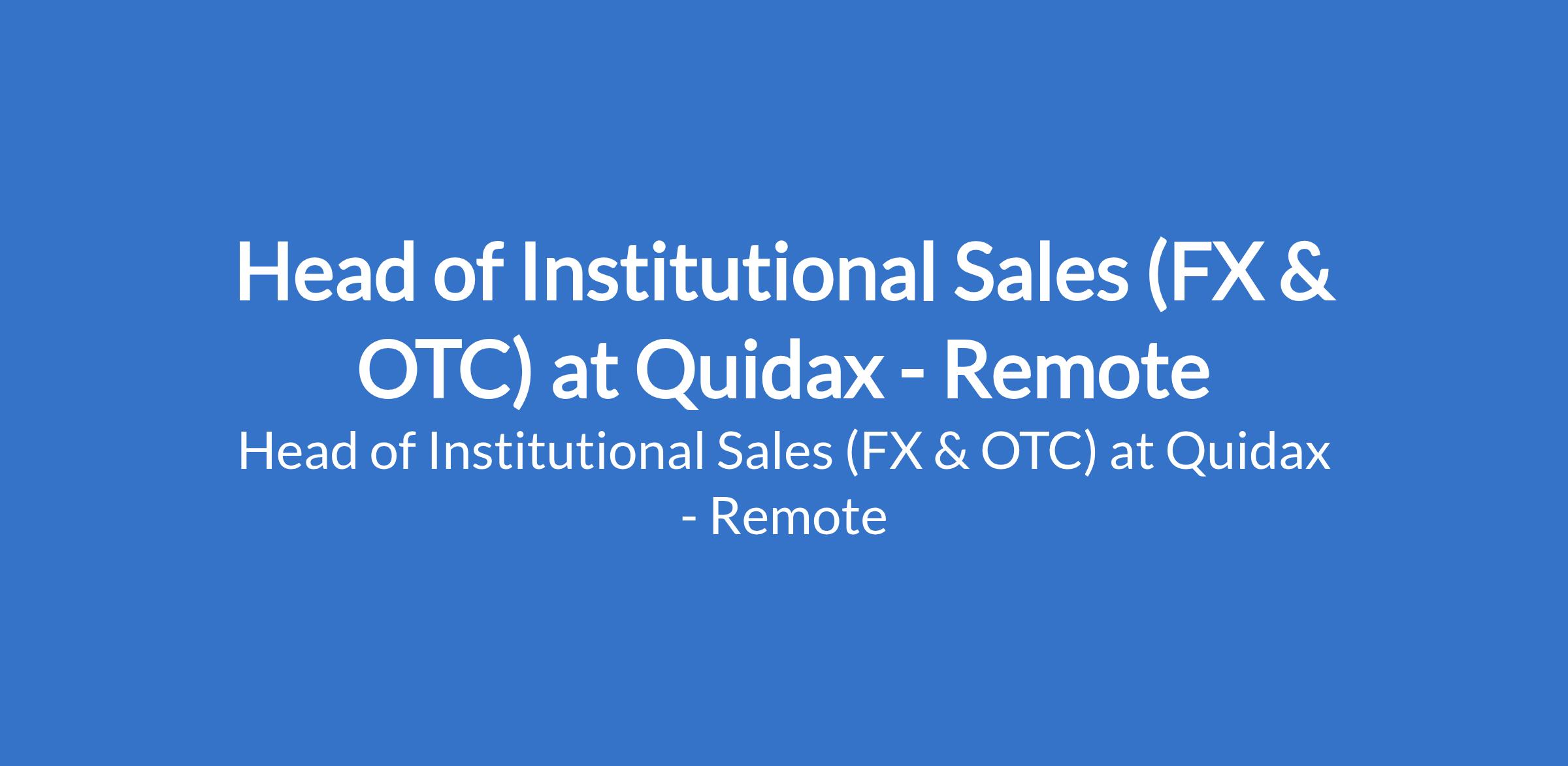 Quidax is recruiting to fill the position of: Head of Institutional Sales (FX & OTC). This is a remote job. Interested candidates should possess relevant qualifications with 7 - 12+ years in OTC crypto trading or institutional sales.