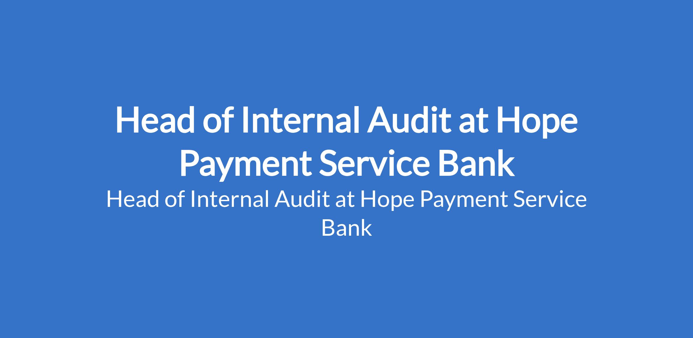 Hope Payment Service Bank is recruiting to fill the position of: Head of Internal Audit. The position is located in Lagos State. Interested candidates should possess a minimum of University Degree in Accounting, Finance, Risk management or any other relevant discipline with a minimum of 8 years post-graduation experience in audit with 3 years in senior management.