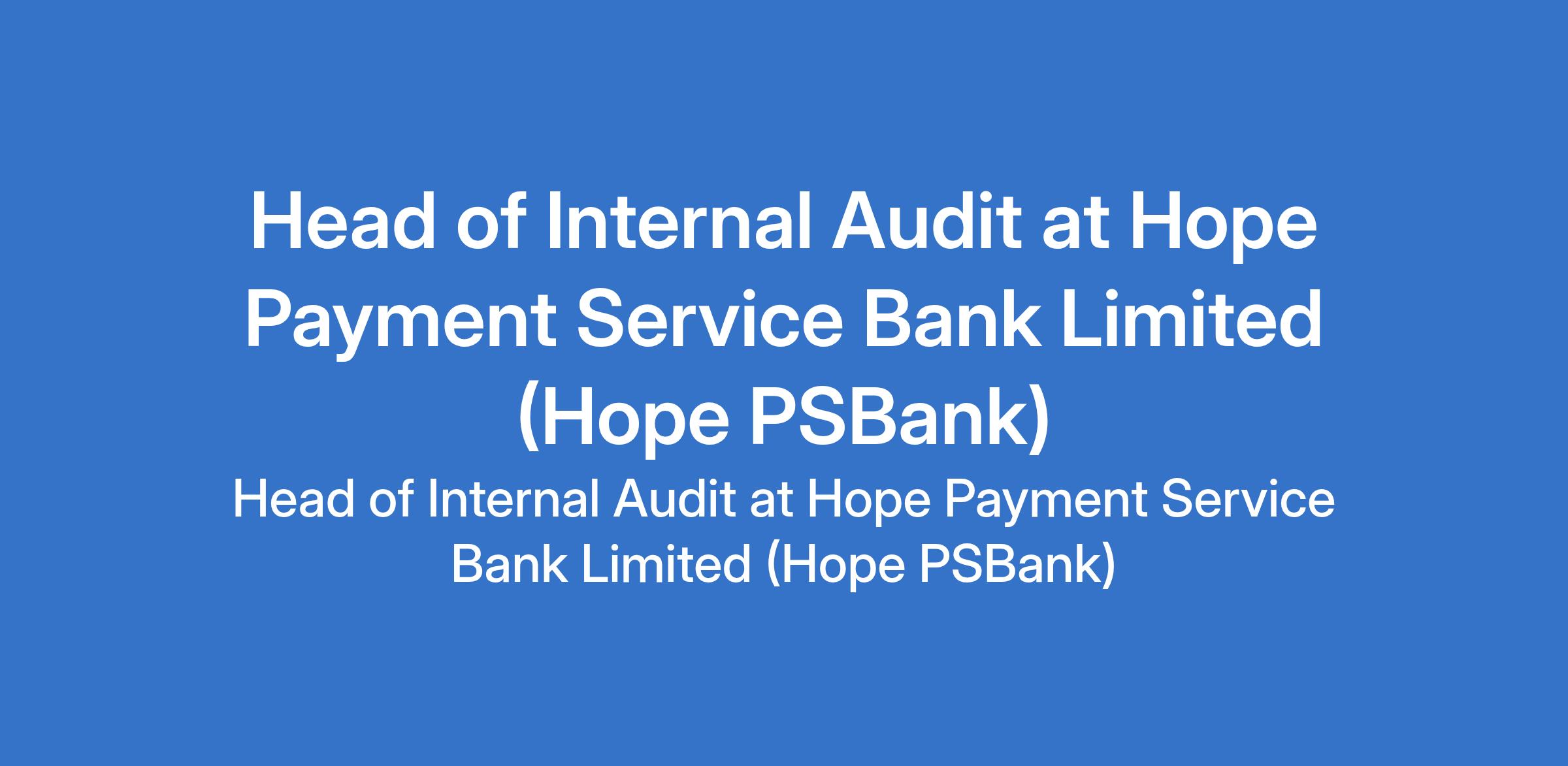 Hope Payment Service Bank Limited (Hope PSBank) is recruiting to fill the position of: Head of Internal Audit. The position is located in Lagos State. Interested candidates should possess a minimum of University Degree in Accounting, Finance, Risk management or any other relevant discipline with a minimum of 8 years post-graduation experience in audit with 3 years in senior management.