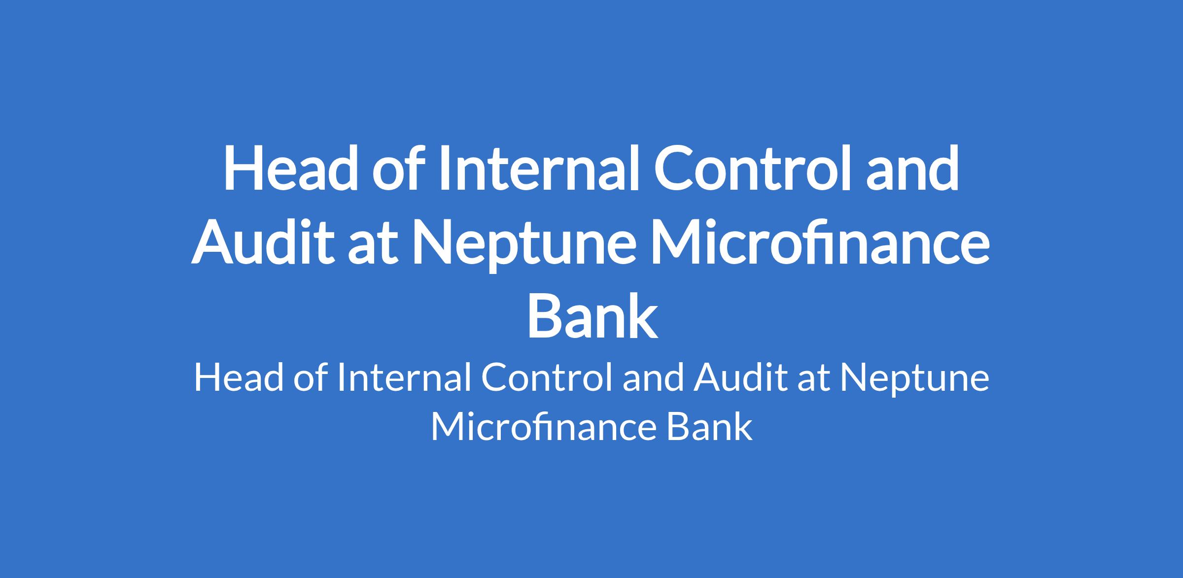 Neptune Microfinance Bank is recruiting to fill the position of: Head of Internal Control and Audit. The position is located in Lagos State. Salary: N400,000 - N500,000 / Month. Interested candidates should possess an HND / Bachelor's Degree in Accounting, Finance, or related fields with a minimum of 5 years experience in internal control and audit, preferably in a microfinance institution or related field.