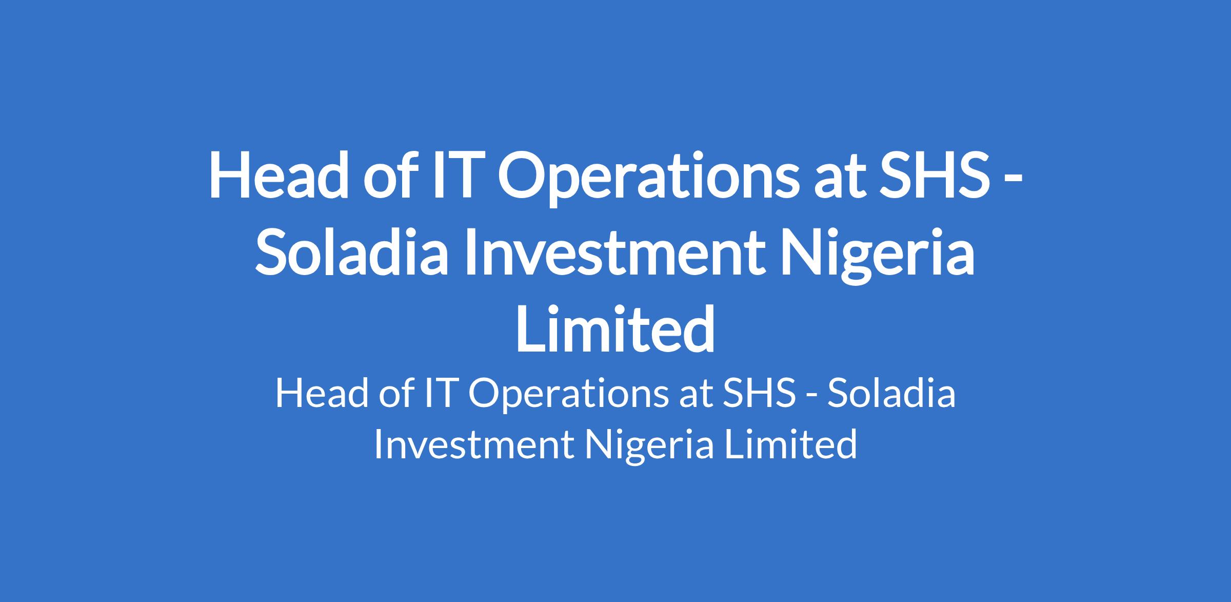 SHS, a division of Soladia Investment Nigeria Limited, is recruiting to fill the position of: Head of IT Operations. The position is located in Lagos State. Interested candidates should possess relevant qualifications with a BSc in Computer Science / IT or related field and 6 - 8 years IT experience, with 3+ years leadership experience.