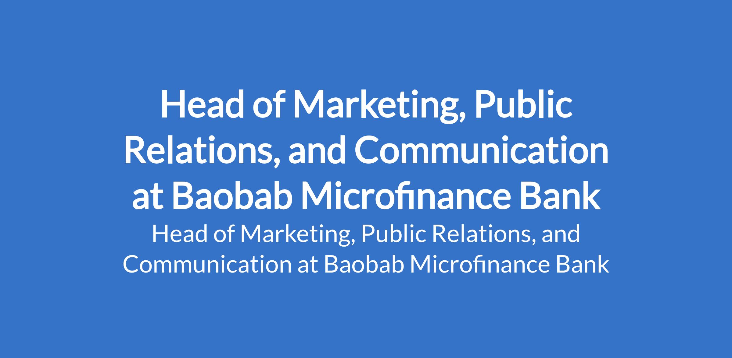 Baobab Microfinance Bank is recruiting to fill the position of: Head of Marketing, Public Relations, and Communication. The position is located in Lagos State. Interested candidates should possess a Bachelor's Degree with a minimum of 10+ years experience in Marketing, PR, and Communications, with at least 3 years in a senior leadership role.